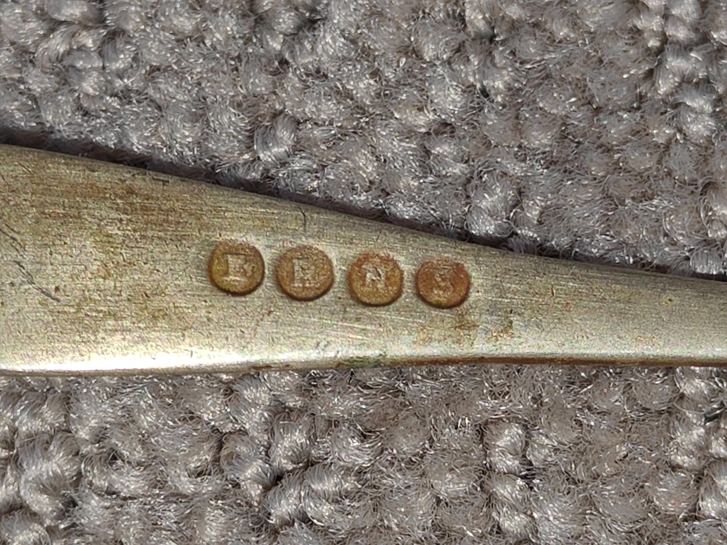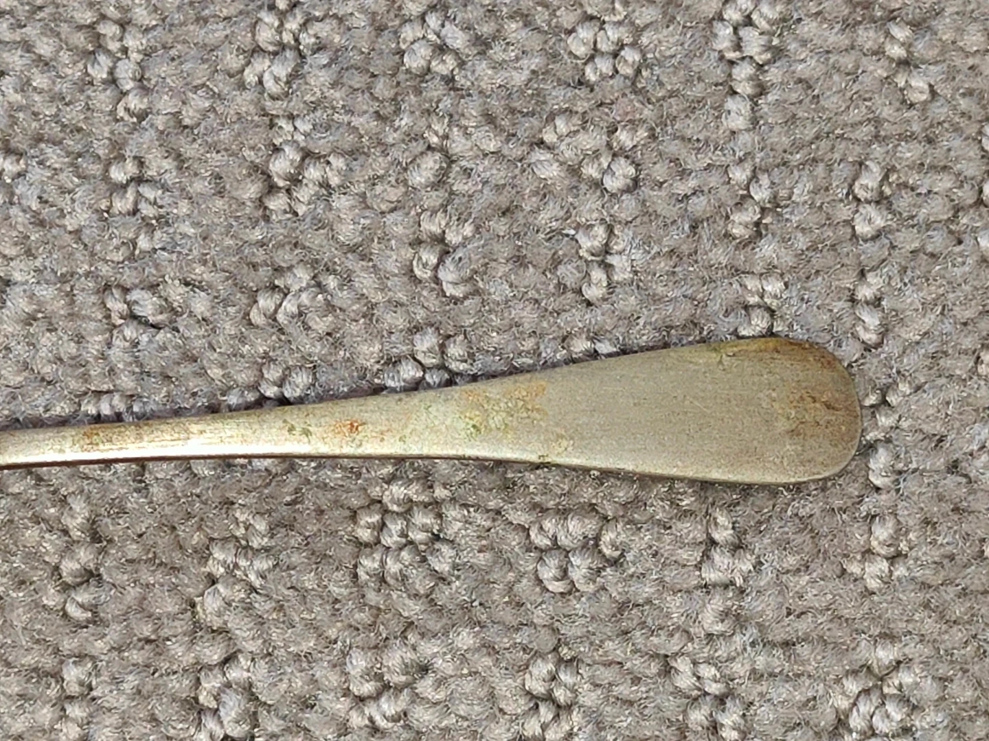 On the back of the handle, the spoon is marked with four distinct hallmarks, including the letters "E," "P," and "N," confirming its material as EPNS. The spoon has a wonderful, aged patina, with a rich, tarnished finish that tells a story of its history. This condition is part of its vintage appeal, but it could be polished to a brighter silver if desired.
