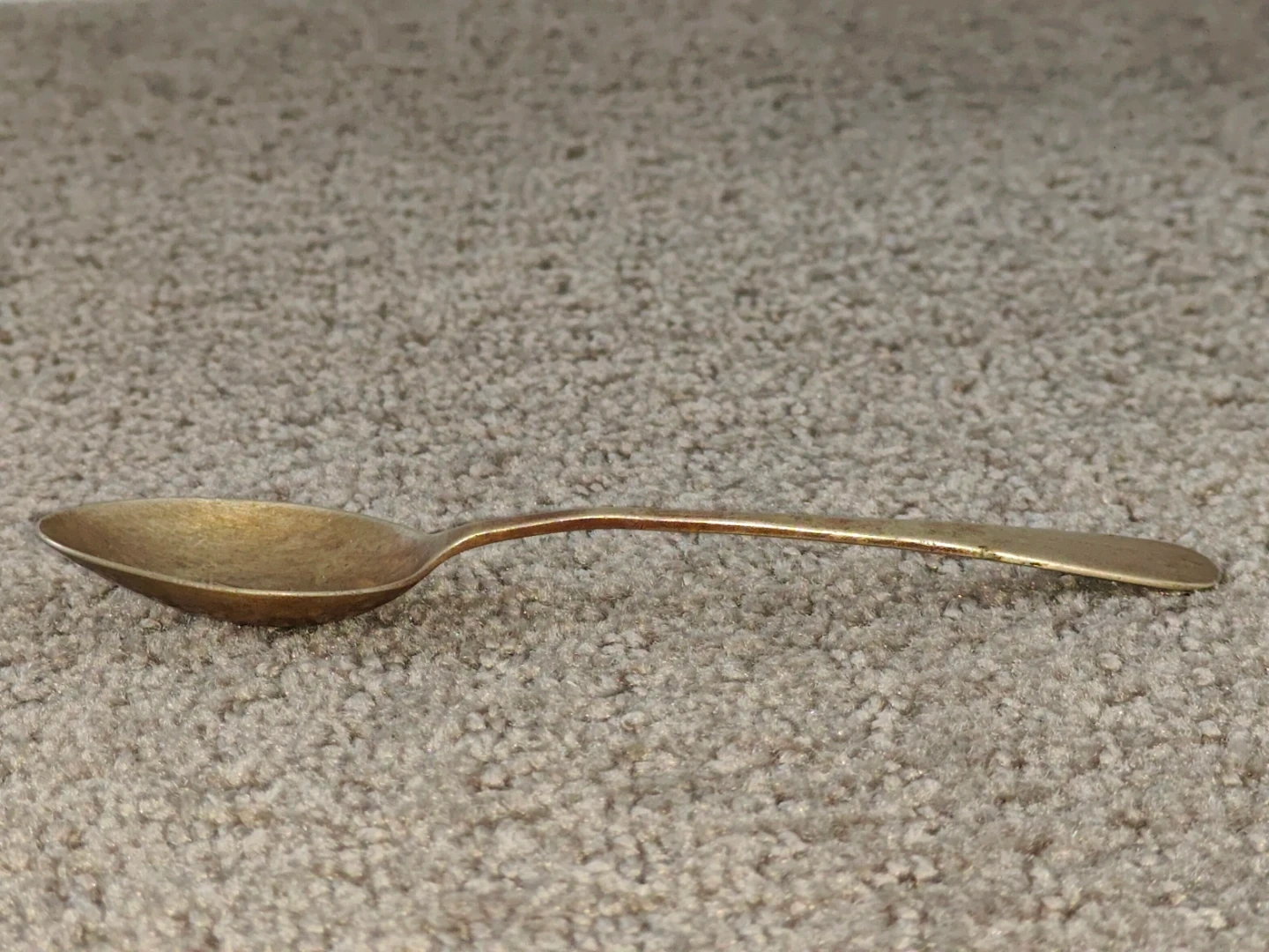 On the back of the handle, the spoon is marked with four distinct hallmarks, including the letters "E," "P," and "N," confirming its material as EPNS. The spoon has a wonderful, aged patina, with a rich, tarnished finish that tells a story of its history. This condition is part of its vintage appeal, but it could be polished to a brighter silver if desired.