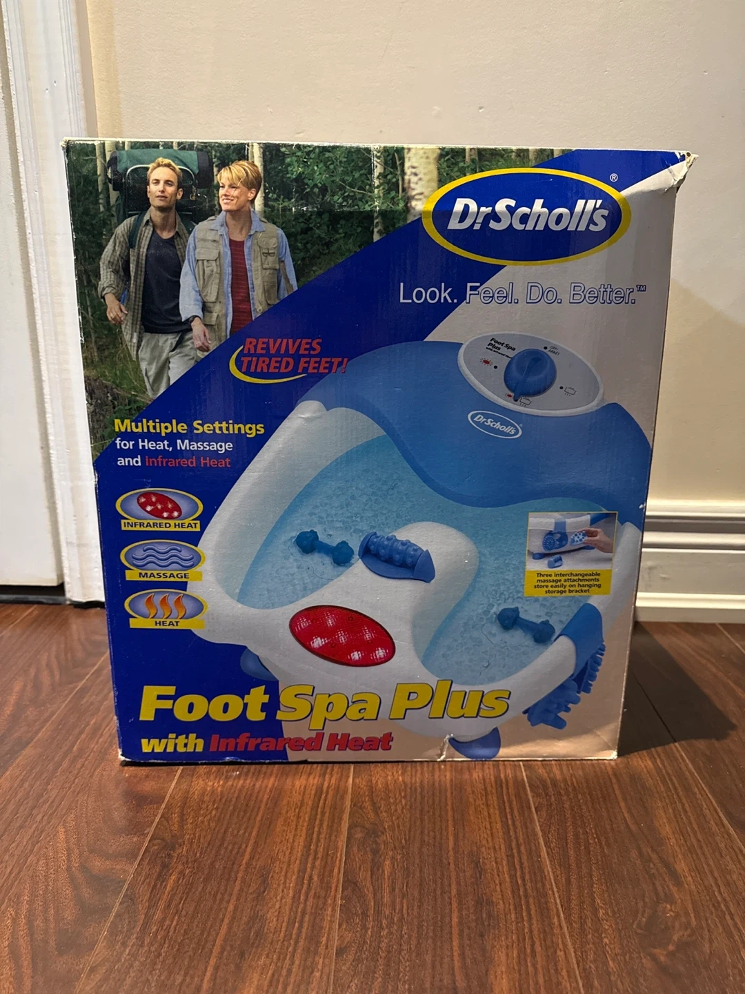 This Dr. Scholl's Foot Spa Plus has infrared heat. It features multiple settings for a customized foot soak. The unit has a blue and white design.