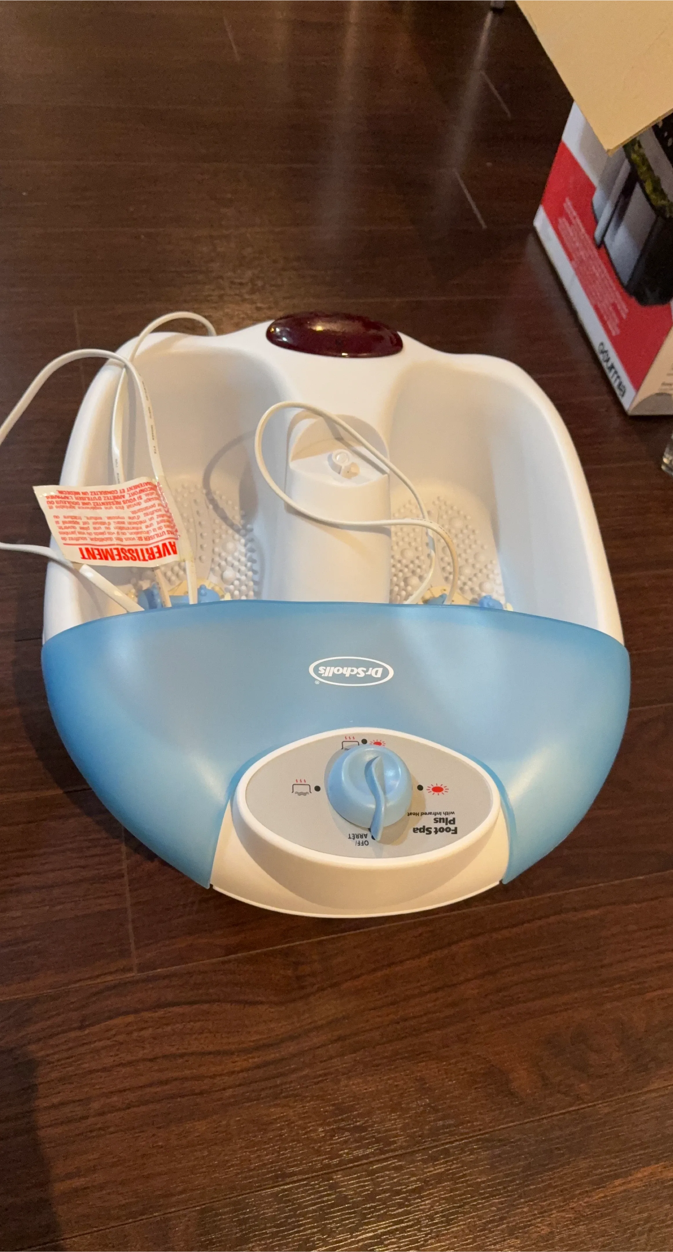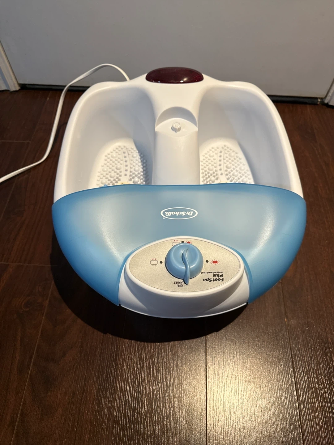 This Dr. Scholl's Foot Spa Plus has infrared heat. It features multiple settings for a customized foot soak. The unit has a blue and white design.