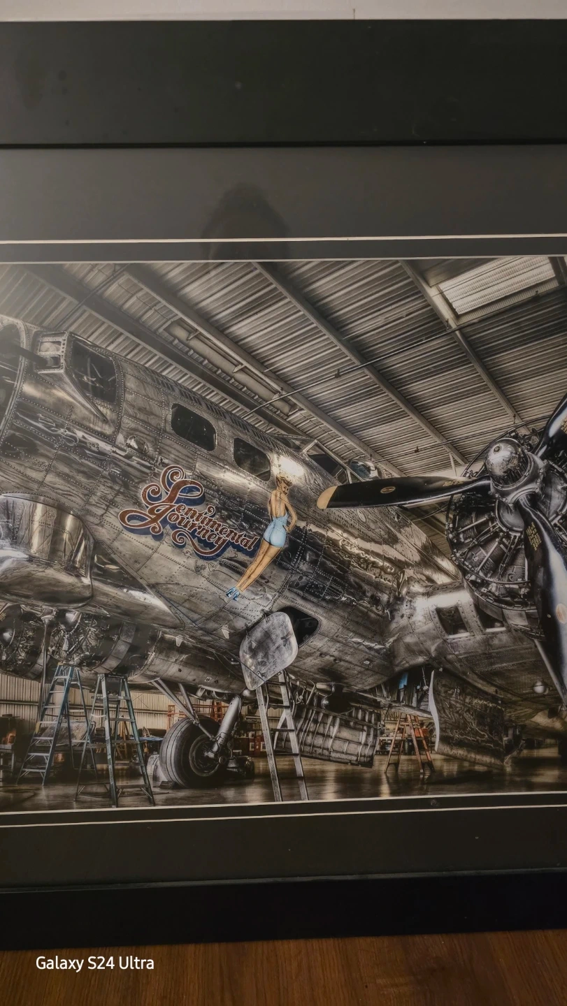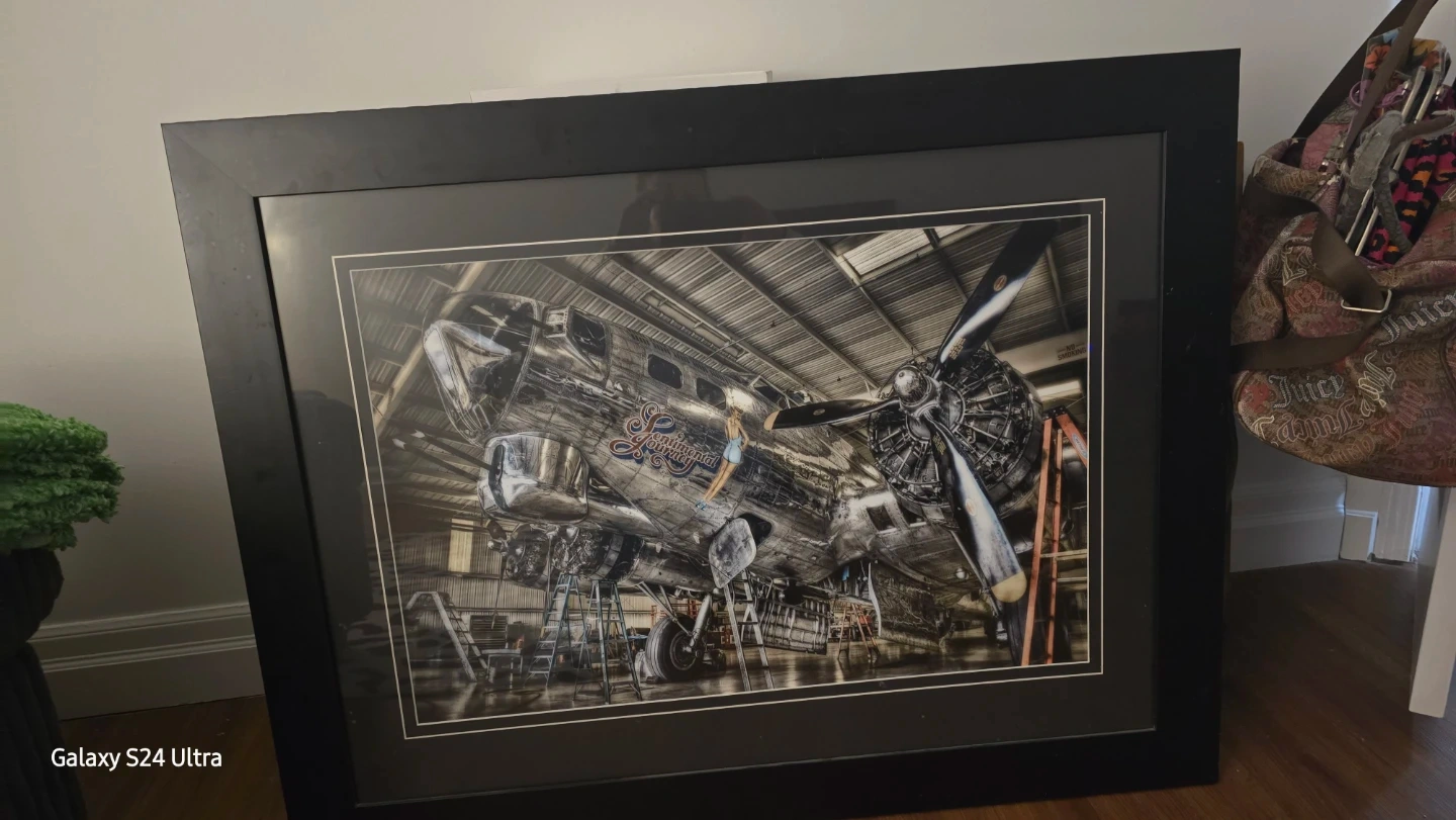 Framed print featuring the "Continental Nurse" B-17 bomber aircraft in a hangar setting. Black wood frame. Sexy lady in middleAdds a unique touch to any space!