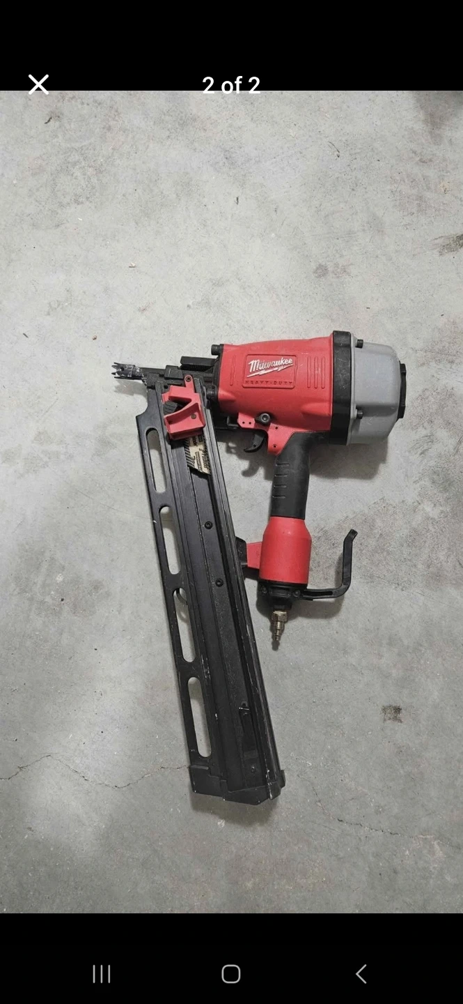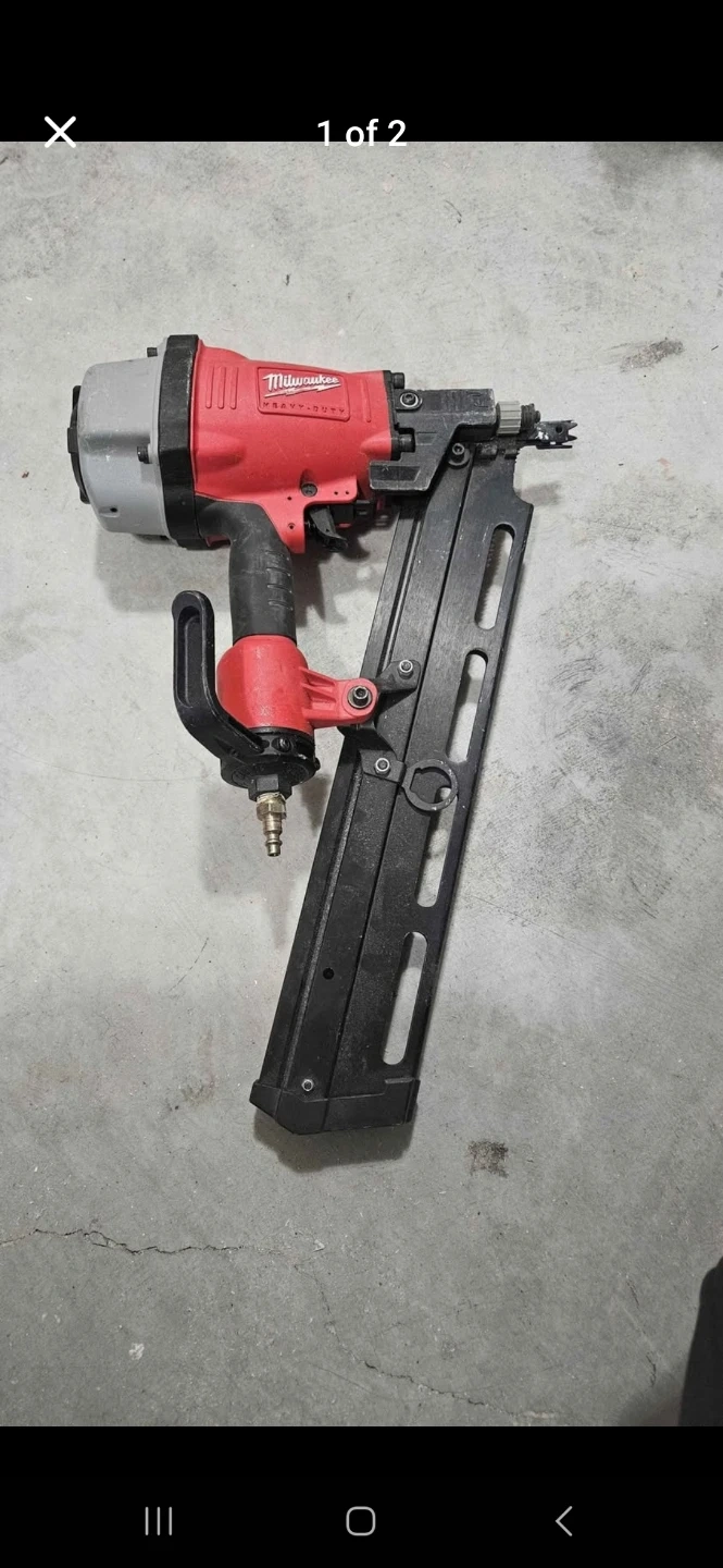 This is a Milwaukee nail gun. It's a pneumatically powered tool. This tool is useful for framing and construction projects. Practically brand new, used like new.
