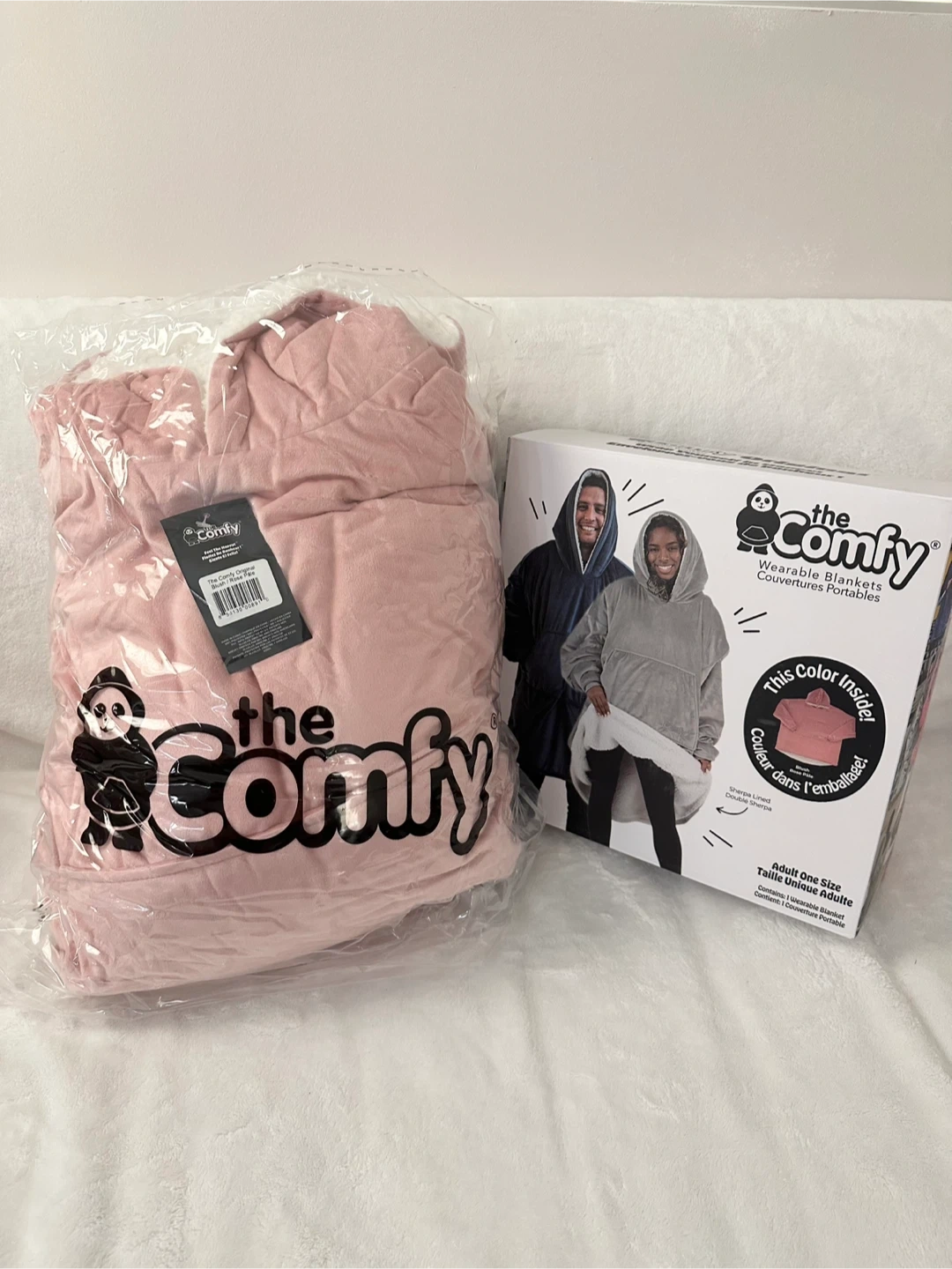 It's a The Comfy wearable blanket hoodie in pink. Super soft plush material with sherpa lining inside. Adult one size fits most. Comes with a large front pocket.
