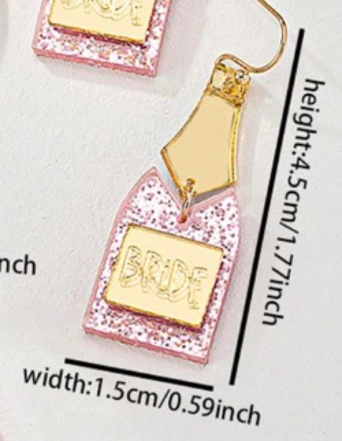 Fun earrings shaped like champagne bottles with glitter accents. They have 'BRIDE' labels on them.