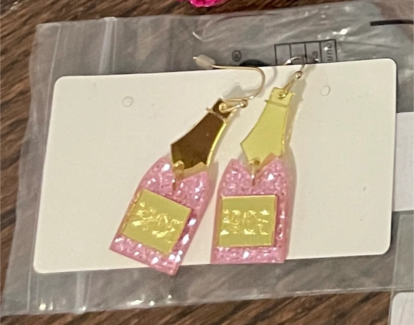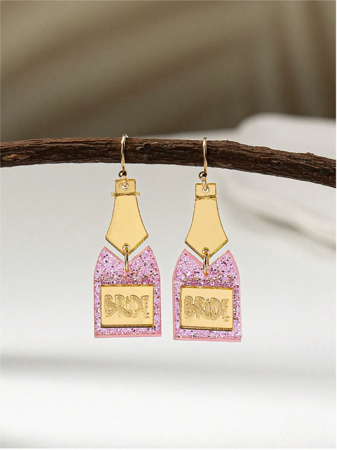 Fun earrings shaped like champagne bottles with glitter accents. They have 'BRIDE' labels on them.