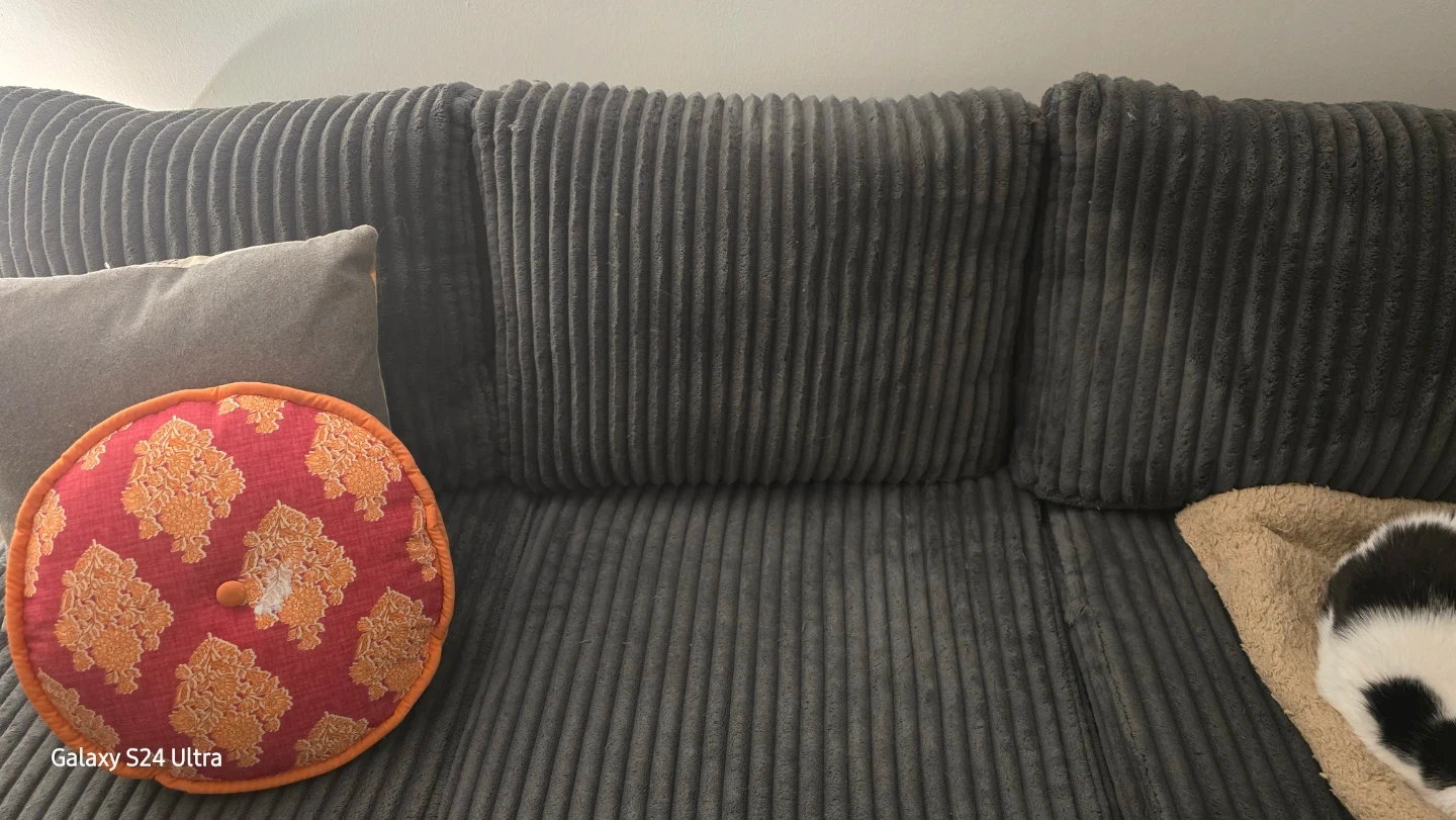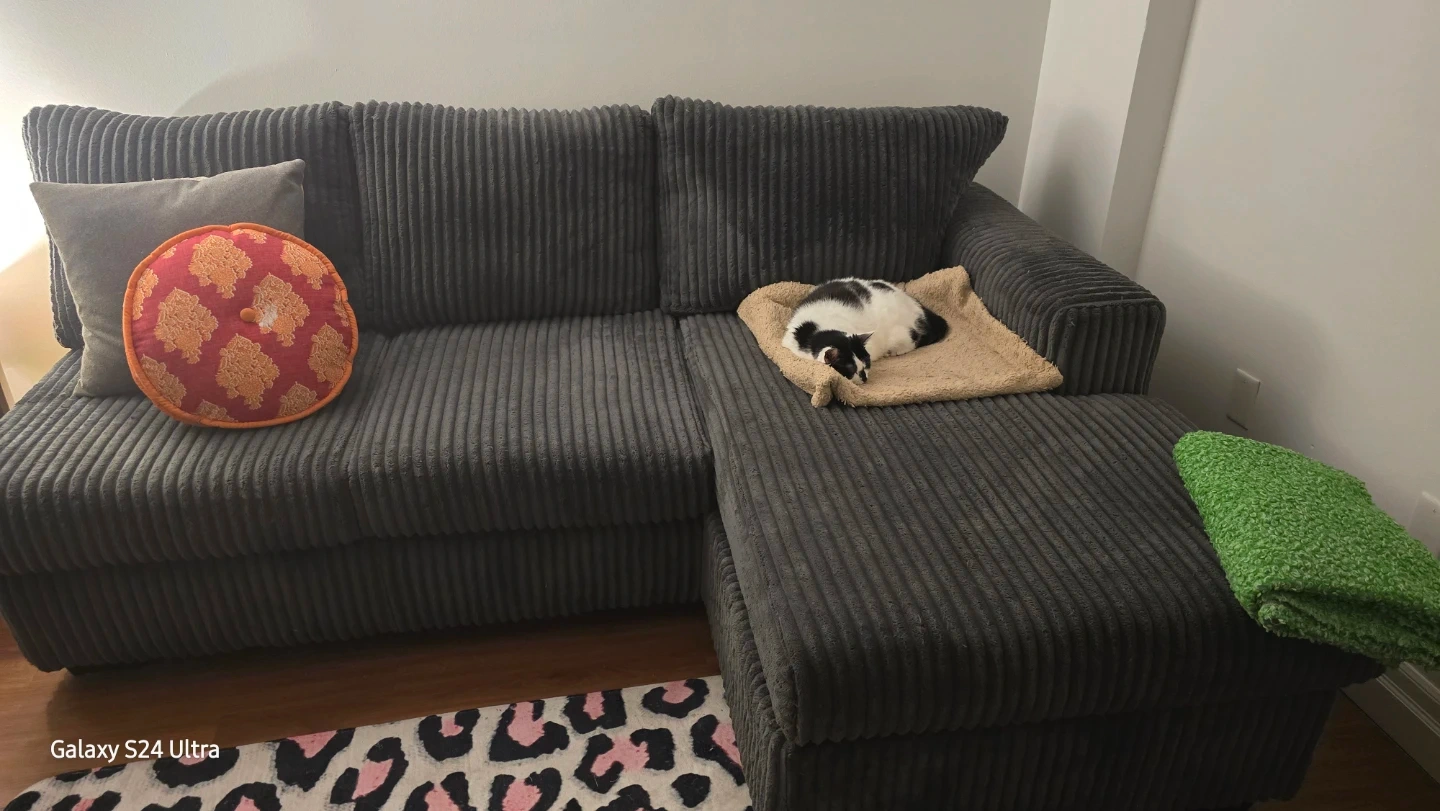 A comfy grey corduroy( love seat part only pics taken of) other side not put together. 6 seater sectional couch. It's made of a soft corduroy material. This couch offers ample seating space for your living room or Basement.