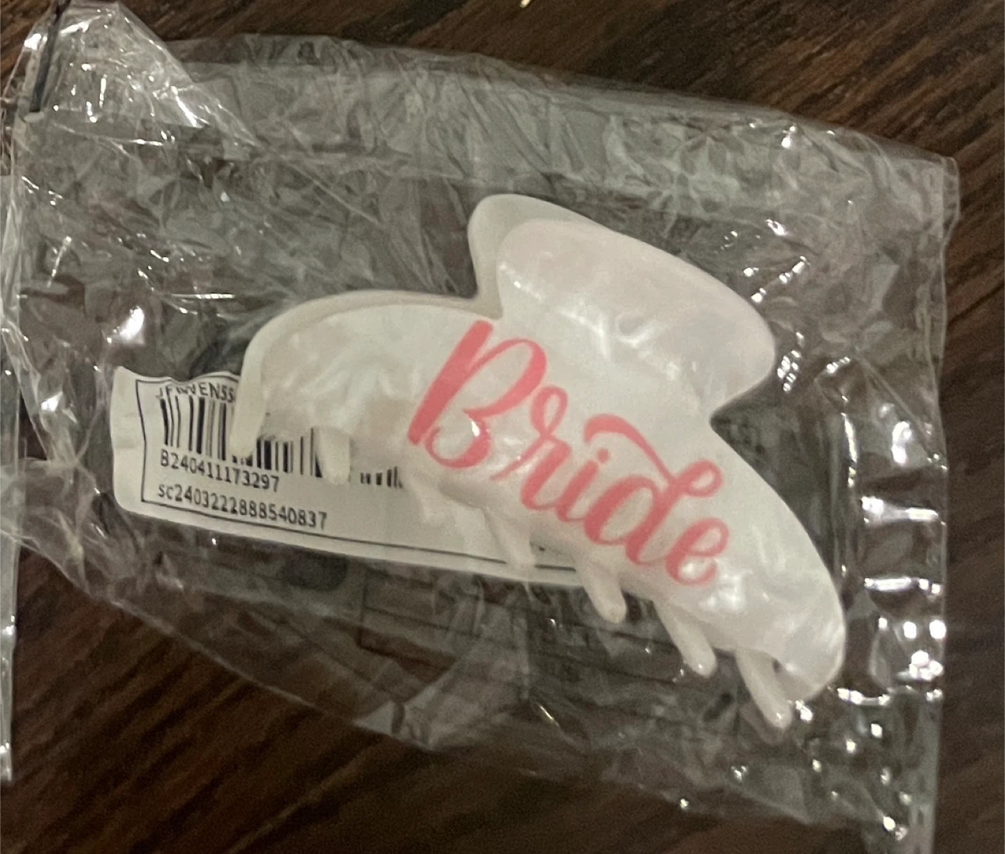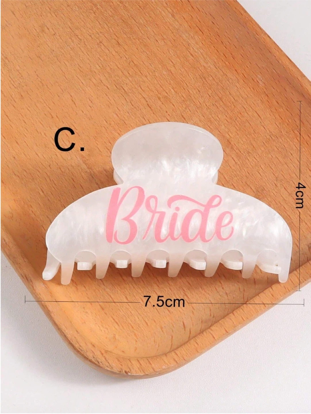 White pearlescent claw clip with 'Bride' text. Measures 7.5cm wide and 4cm tall. It's a great accessory for bridal events! Brand new, never worn. Pick up near Yonge and bloor.