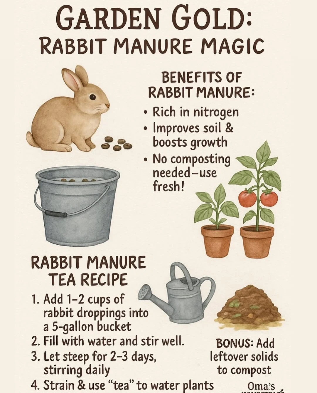 Rabbit manure is rich in nitrogen and improves soil, boosting plant growth. It's ready to use fresh, with no composting needed! You can even make rabbit manure tea for your plants