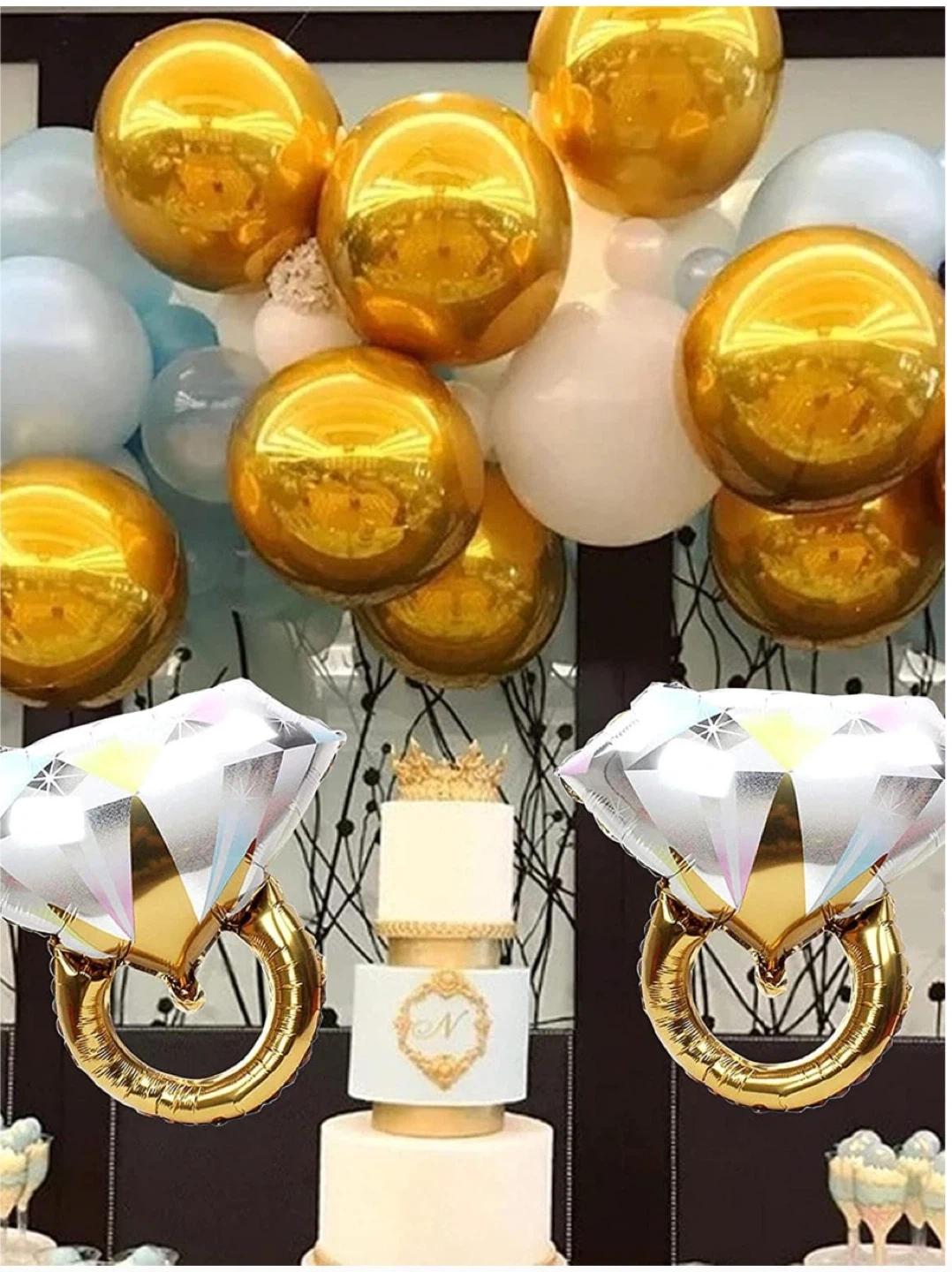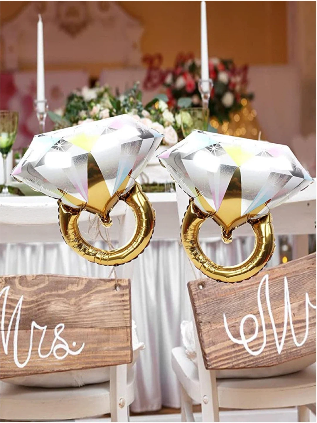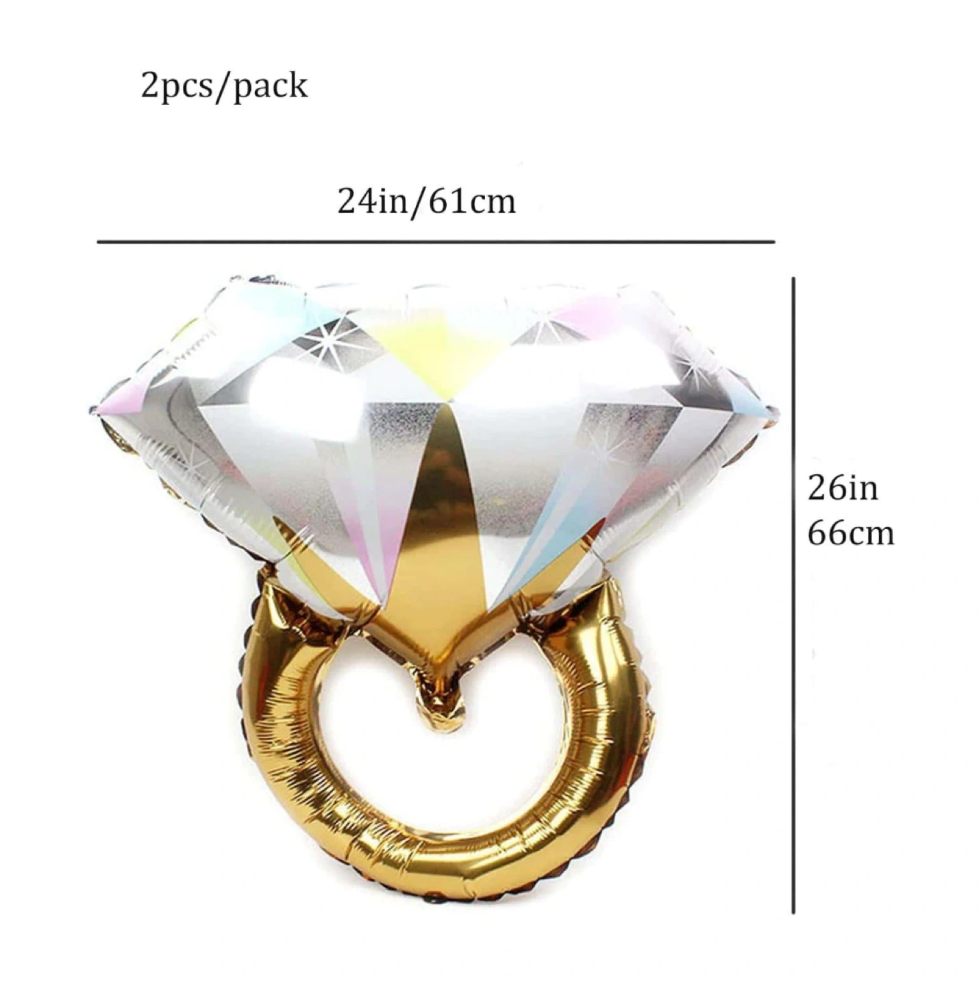 Add some sparkle to your next celebration with these diamond ring-shaped foil balloons. Each balloon measures 24in/61cm wide and 26in/66cm tall. They're perfect for engagement parties, bachelorette parties, or wedding decorations!