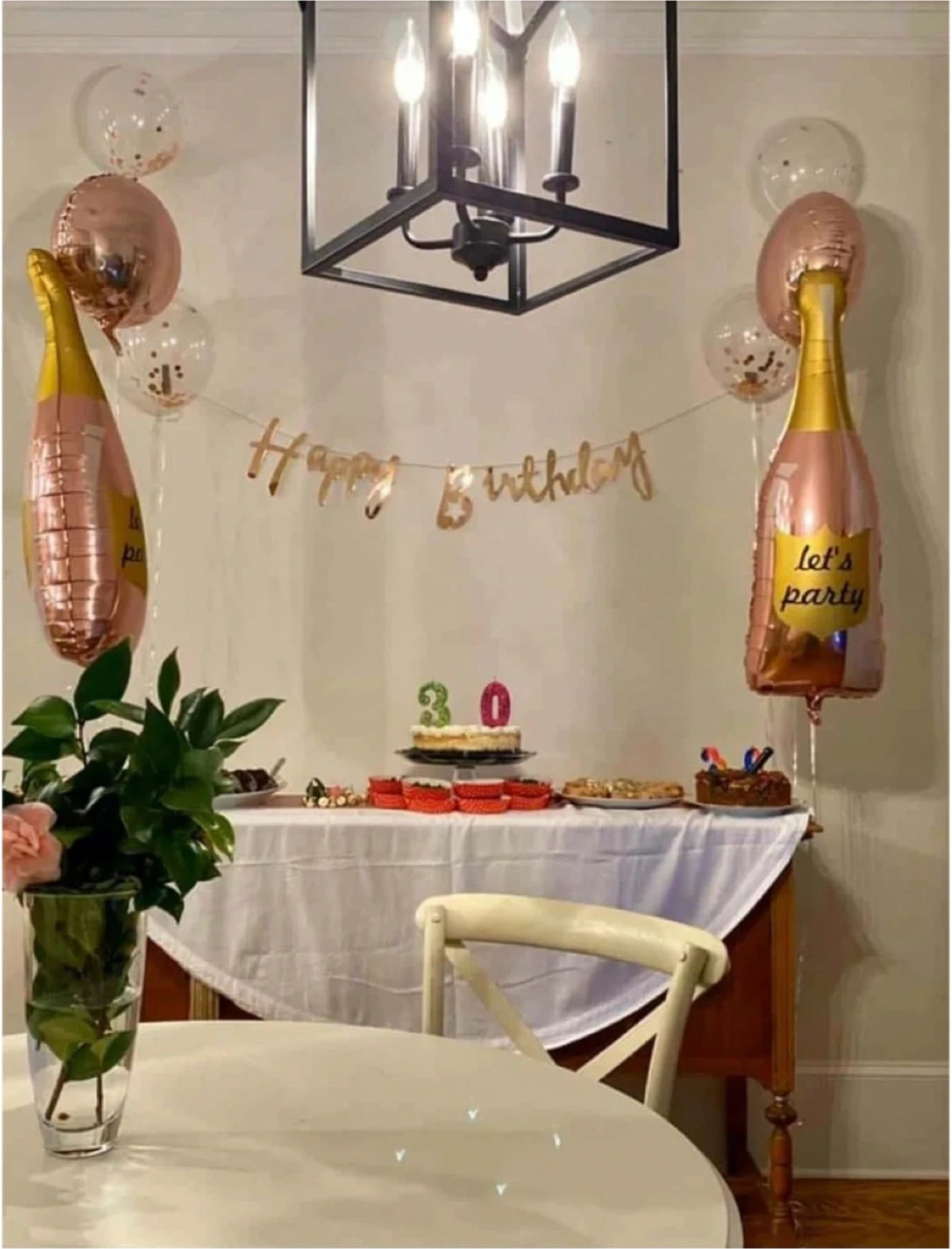These are champagne bottle-shaped foil balloons. They're pink and gold with "let's party" text. Each balloon measures 41.73 inches tall and 15.35 inches wide.