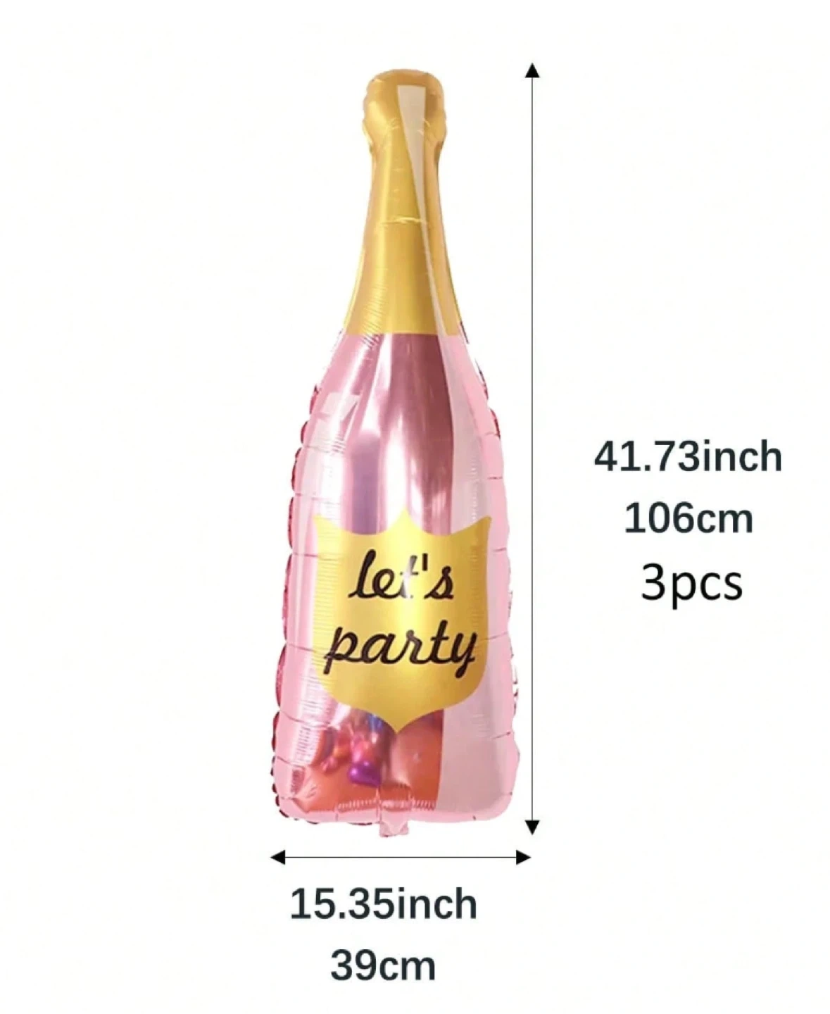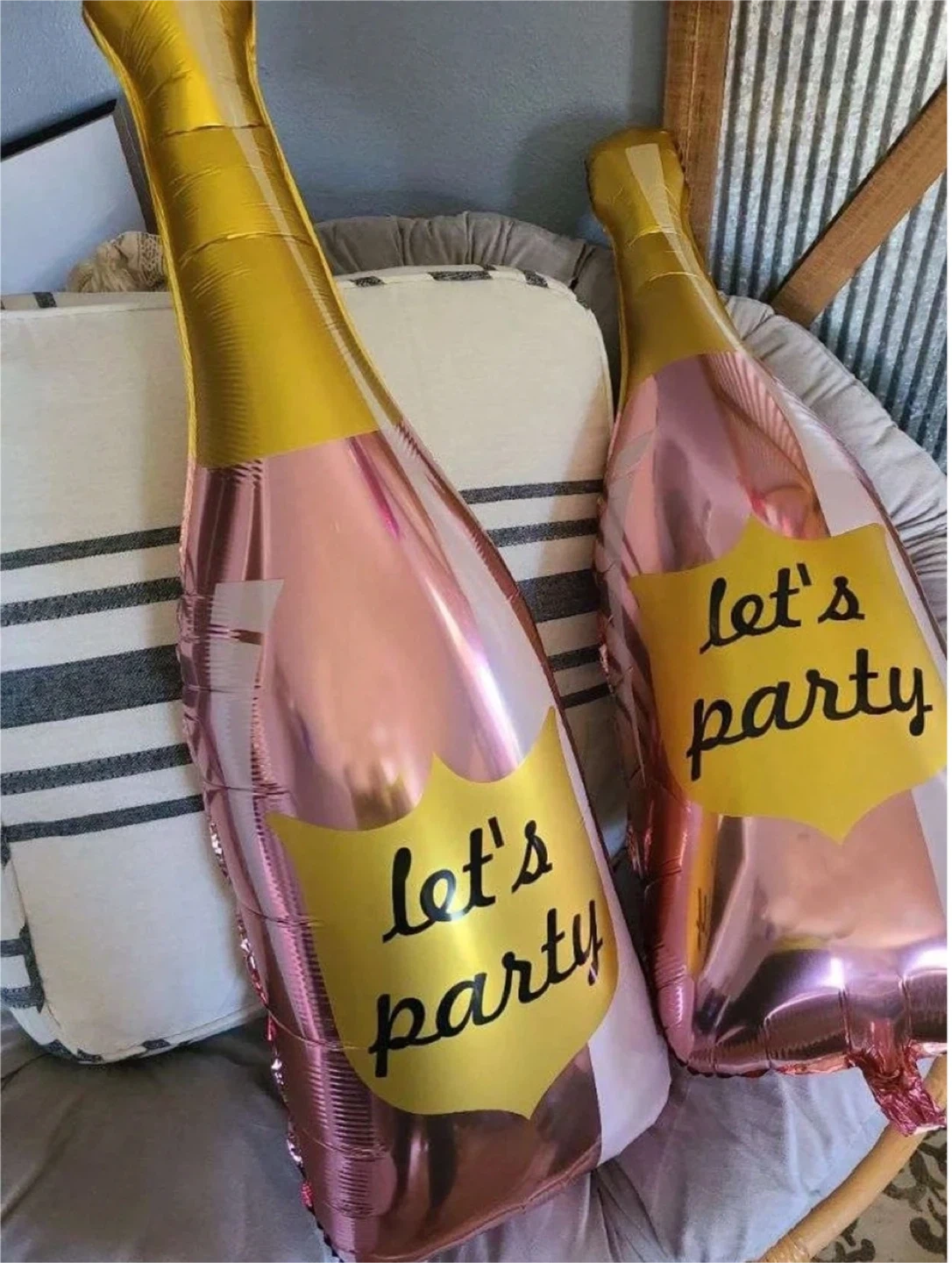 These are champagne bottle-shaped foil balloons. They're pink and gold with "let's party" text. Each balloon measures 41.73 inches tall and 15.35 inches wide.