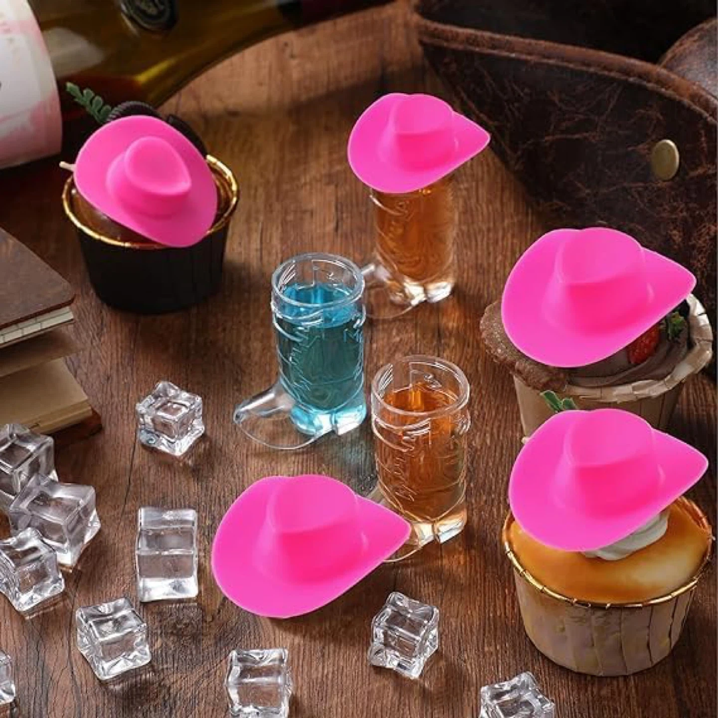 Set of fun pink cowboy hat toppers for shot glasses! They measure 5cm/2in high and 6cm/2.4in wide, fitting most standard shot glasses. These toppers add a playful touch to any party or gathering.