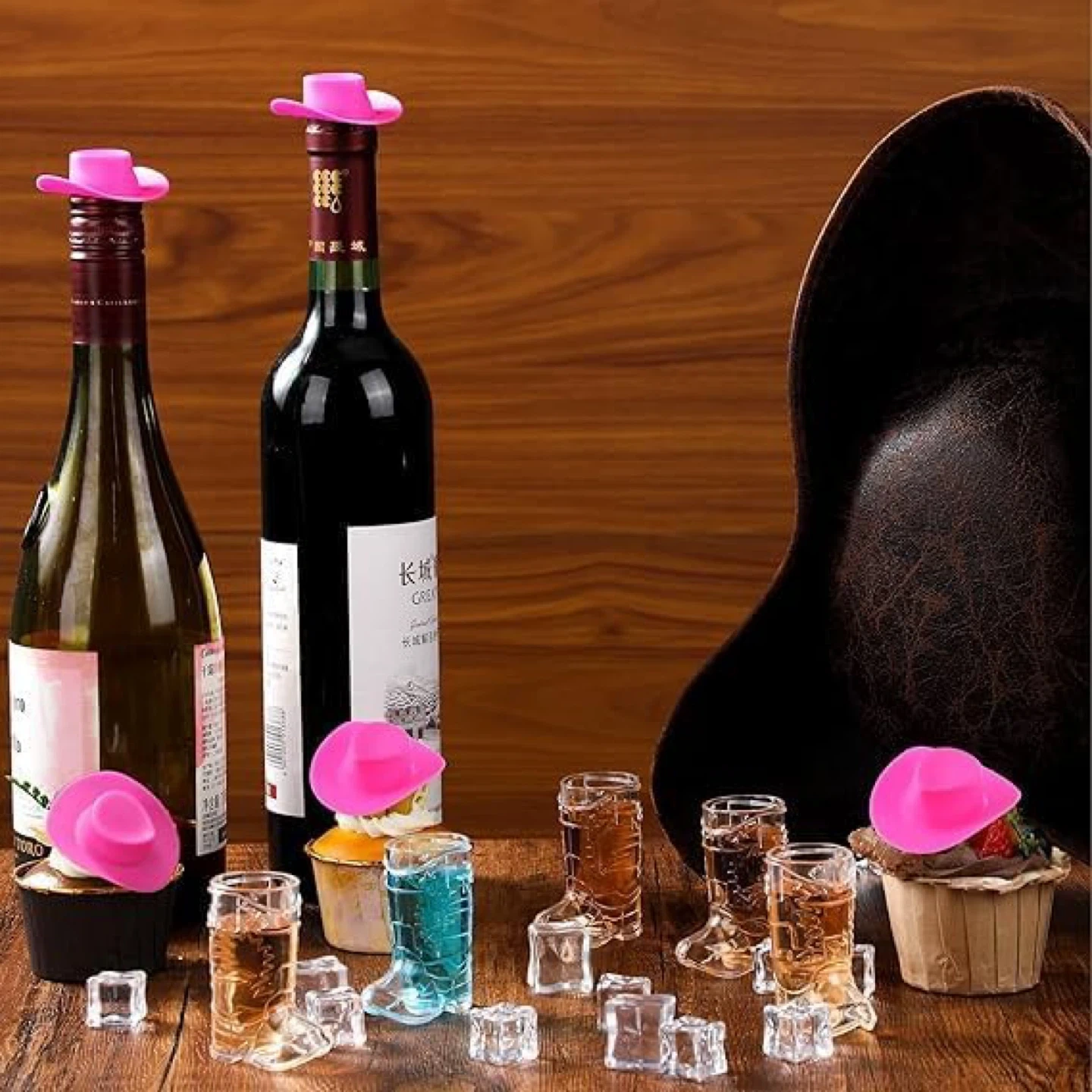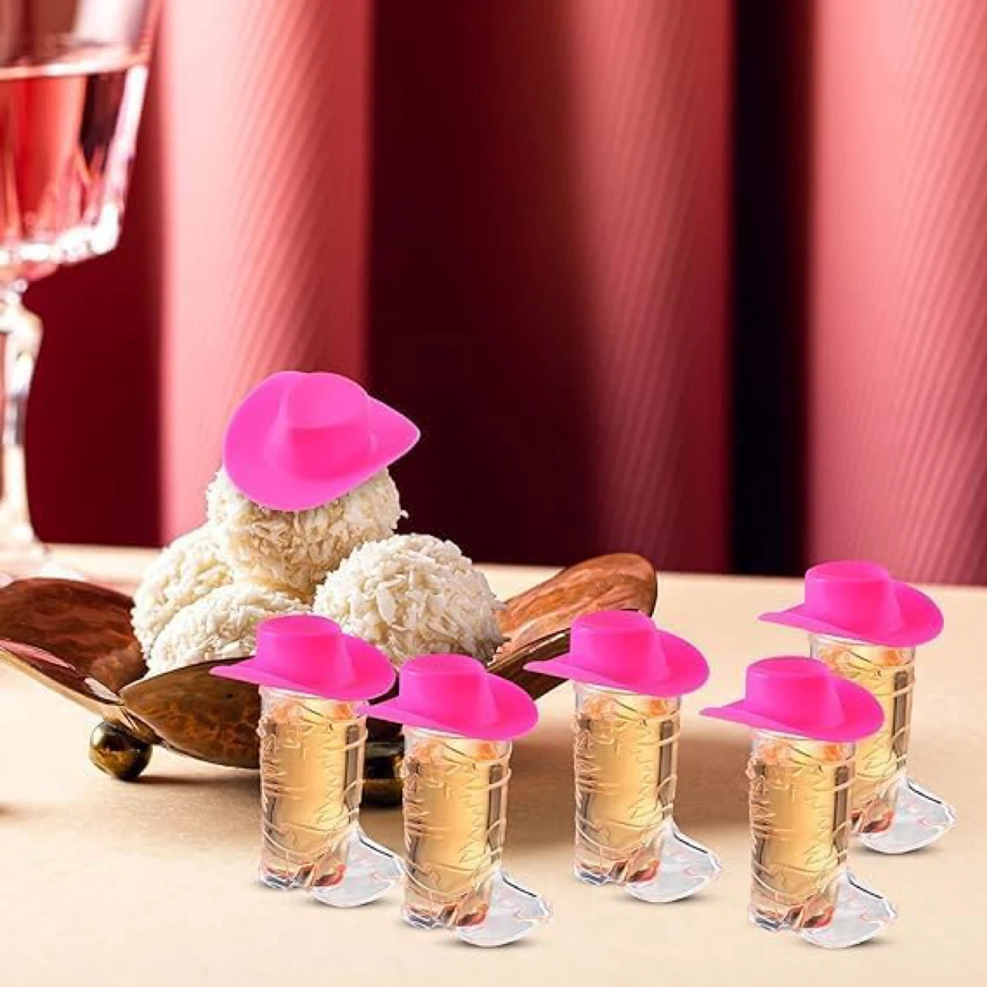 Set of fun pink cowboy hat toppers for shot glasses! They measure 5cm/2in high and 6cm/2.4in wide, fitting most standard shot glasses. These toppers add a playful touch to any party or gathering.