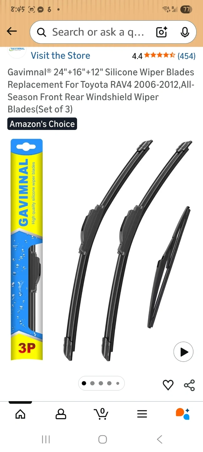 This is a 3-piece set of GAVMINAL silicone wiper blades designed for Toyota RAV4 models from 2006-2012. The set includes a 24-inch driver's side blade, a 16-inch passenger's side blade, and a 12-inch rear blade. They're made of natural silicone for silent, scratch-free wiping in all weather conditions.