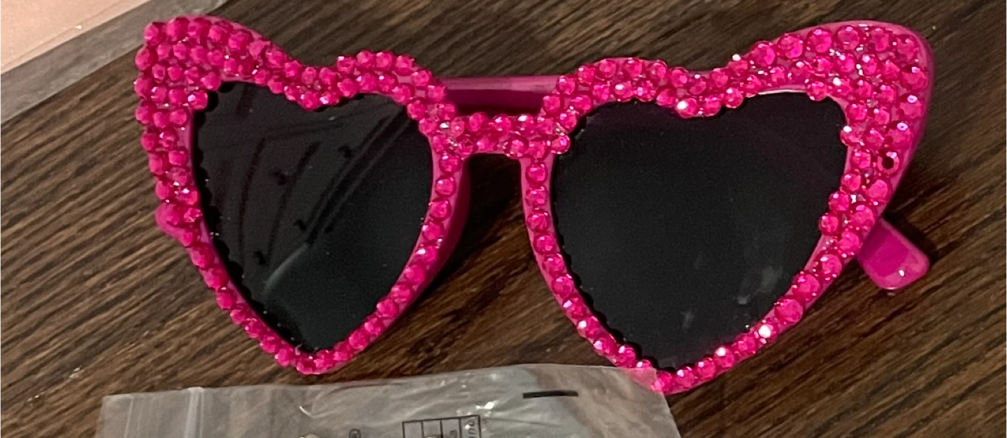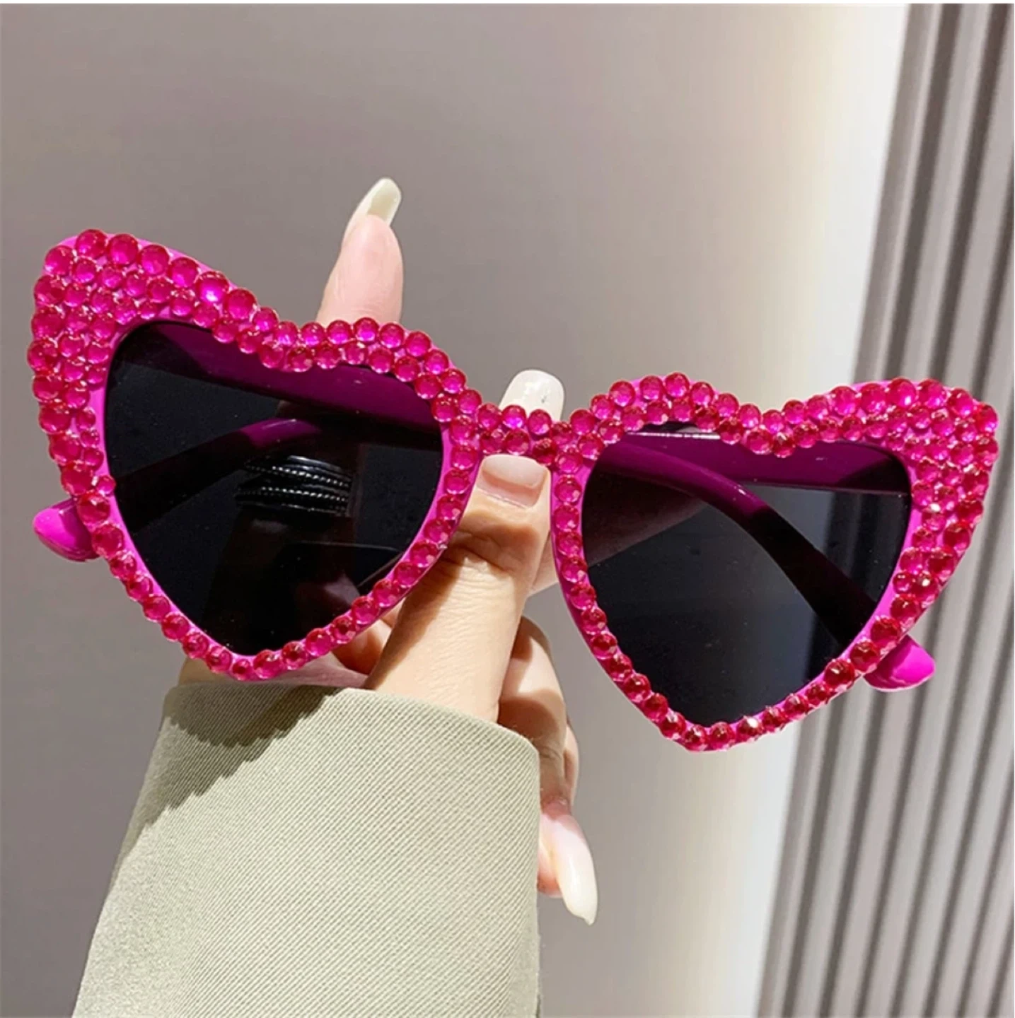 These fun pink sunglasses feature a heart shape embellished with rhinestones. They offer a playful style! Perfect for adding a pop of sparkle to any outfit, a bachelorette party, bridal shower. Wedding event, etc.