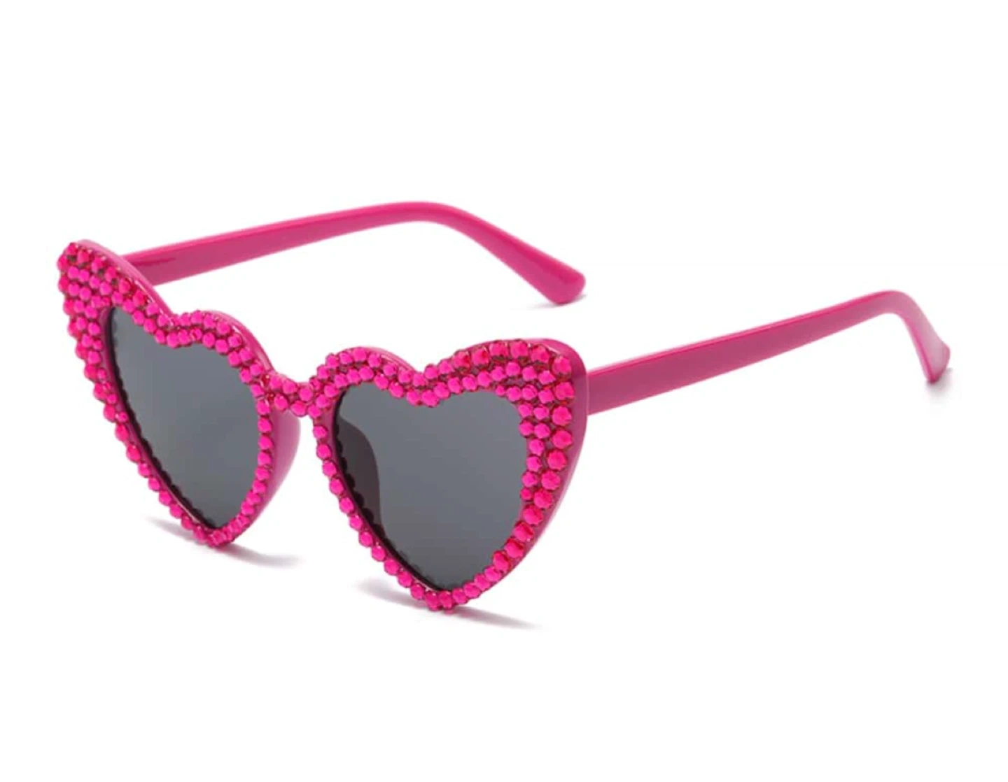 These fun pink sunglasses feature a heart shape embellished with rhinestones. They offer a playful style! Perfect for adding a pop of sparkle to any outfit, a bachelorette party, bridal shower. Wedding event, etc.