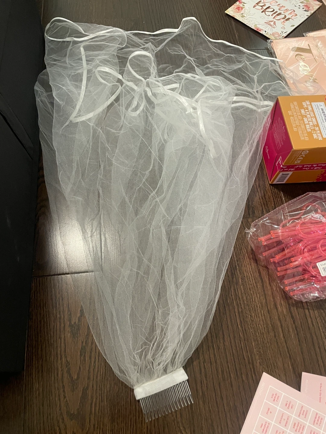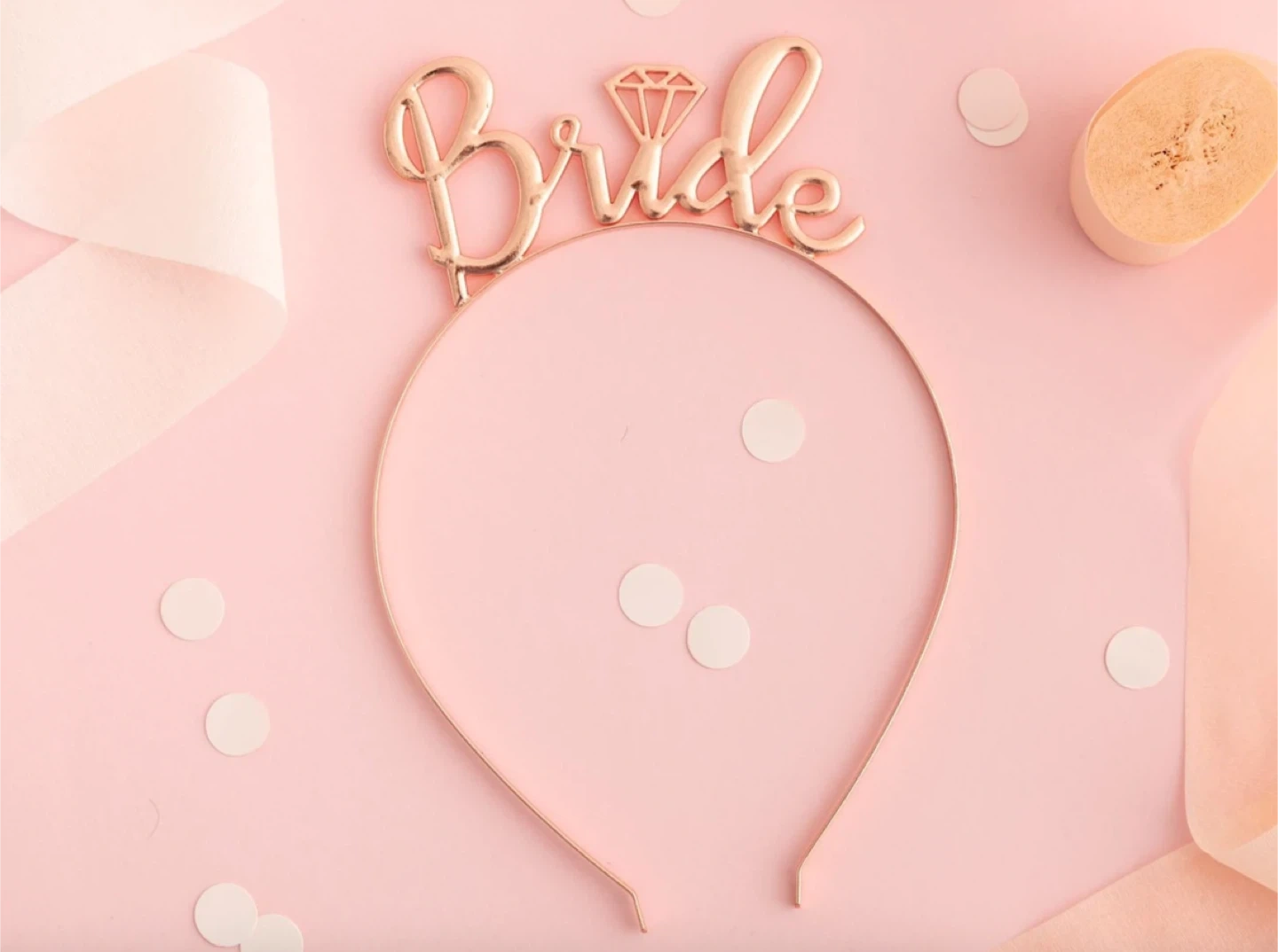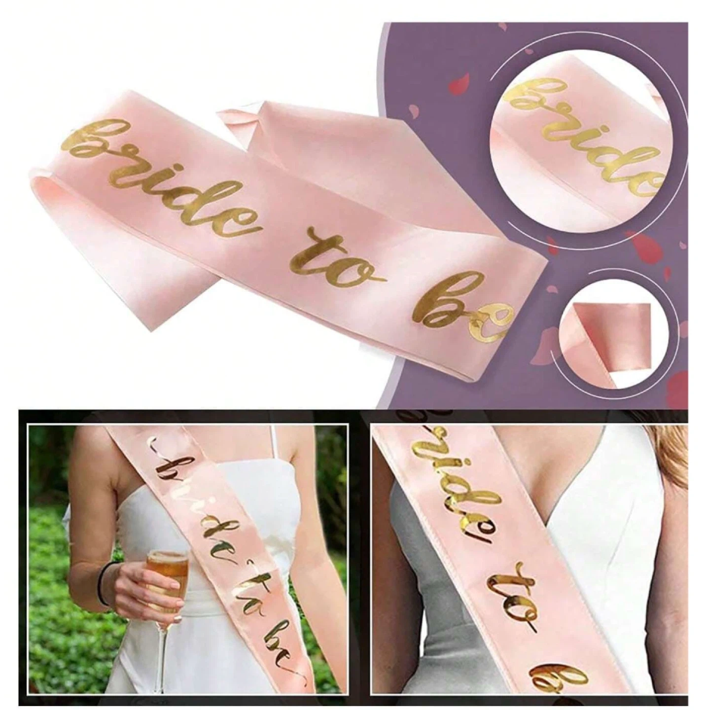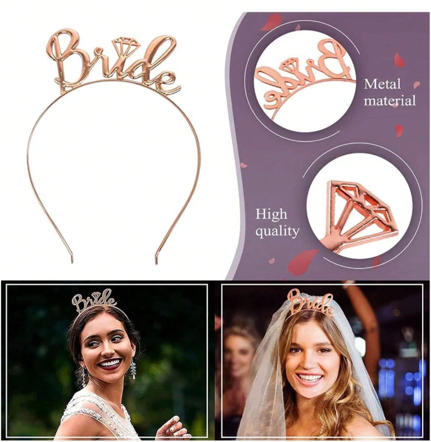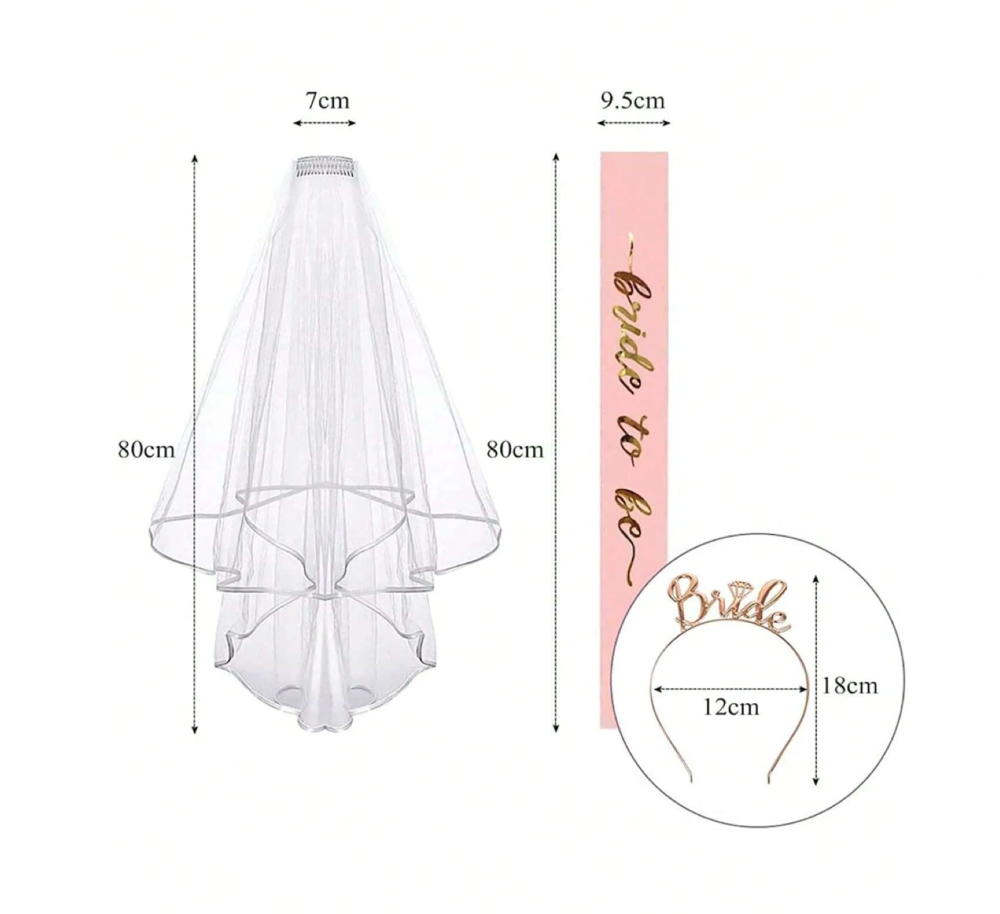 This set includes a 'Bride to be' sash, a double-layer veil, and a rose gold 'Bride' headband. The accessories are made from quality materials for a bachelorette party or wedding shower. Great for celebrating the bride-to-be!