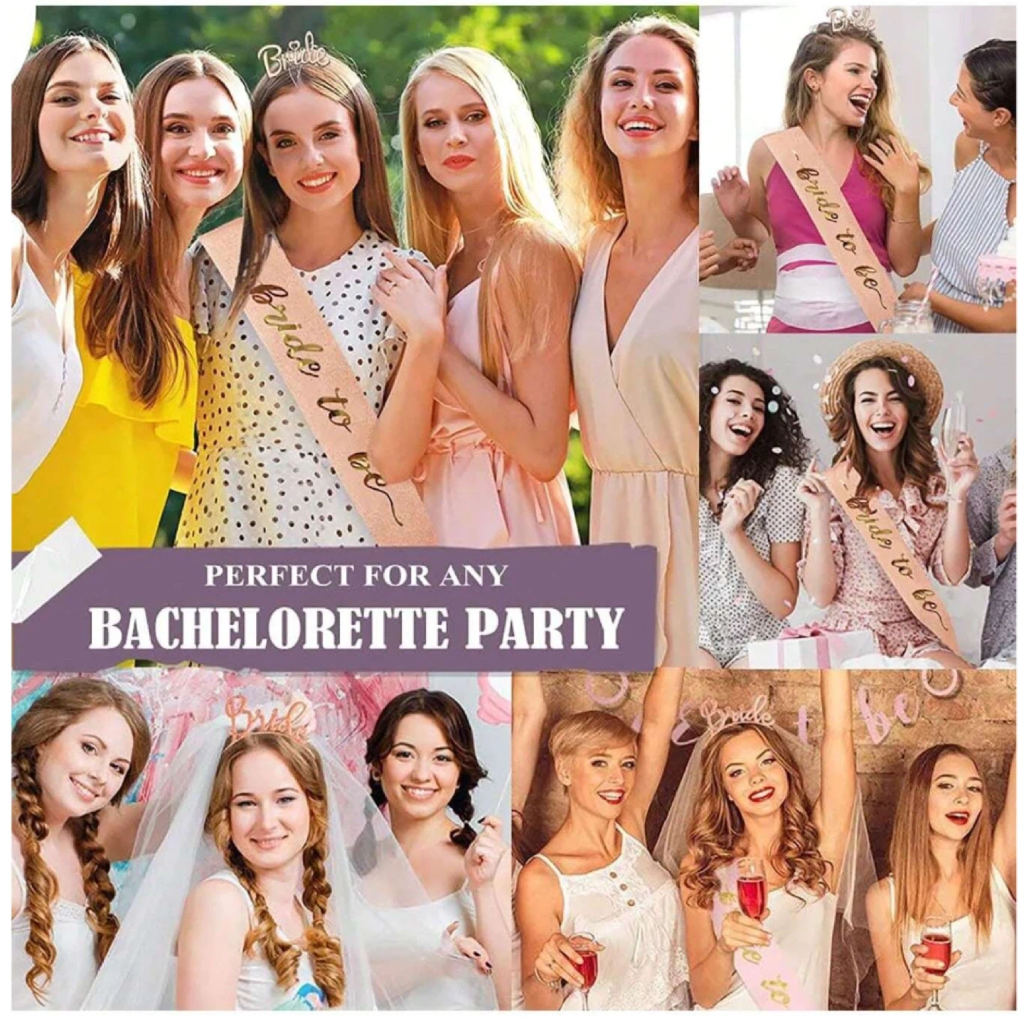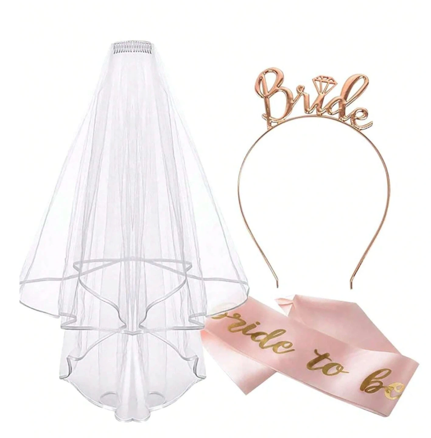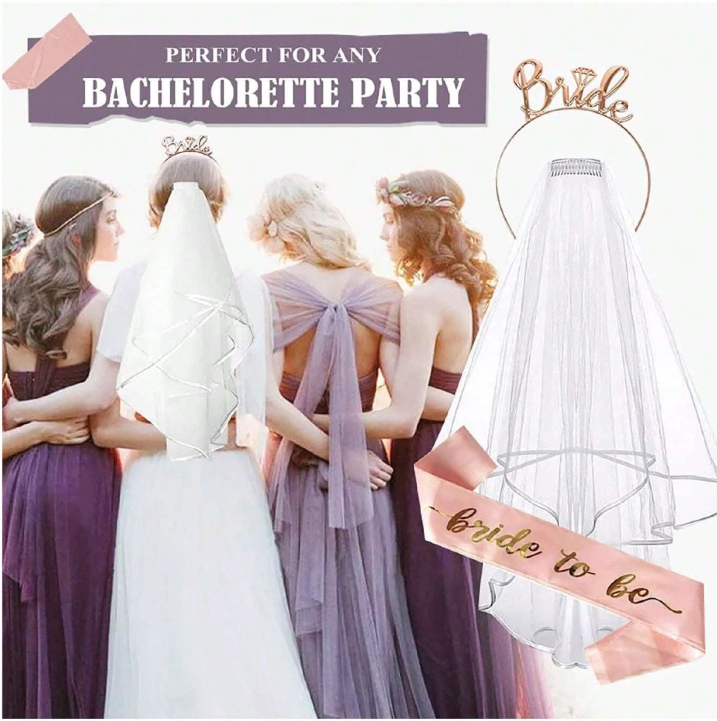 This set includes a 'Bride to be' sash, a double-layer veil, and a rose gold 'Bride' headband. The accessories are made from quality materials for a bachelorette party or wedding shower. Great for celebrating the bride-to-be!