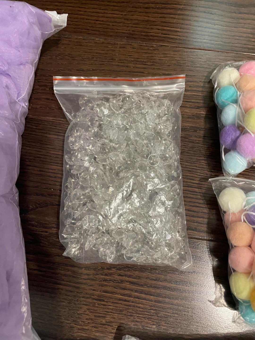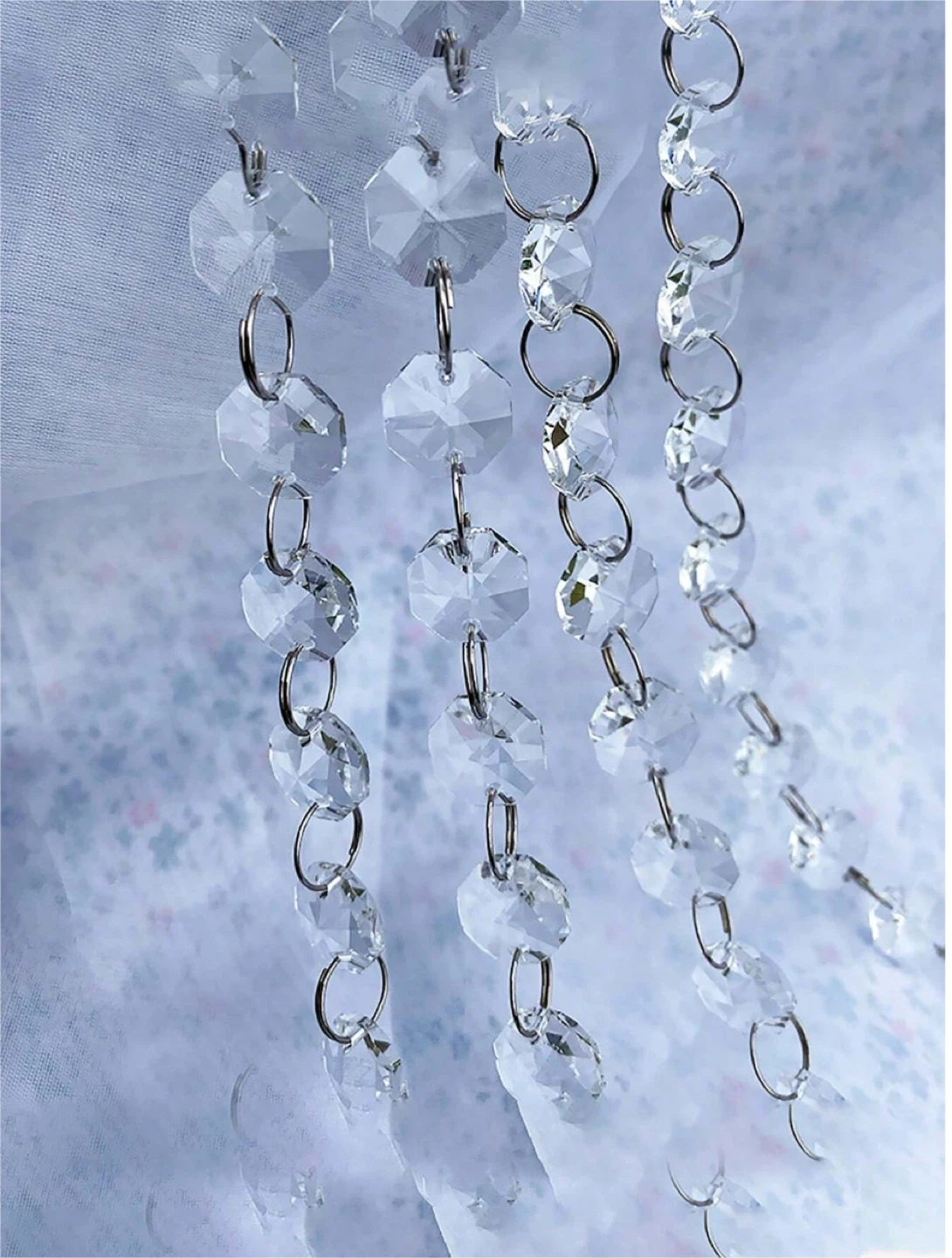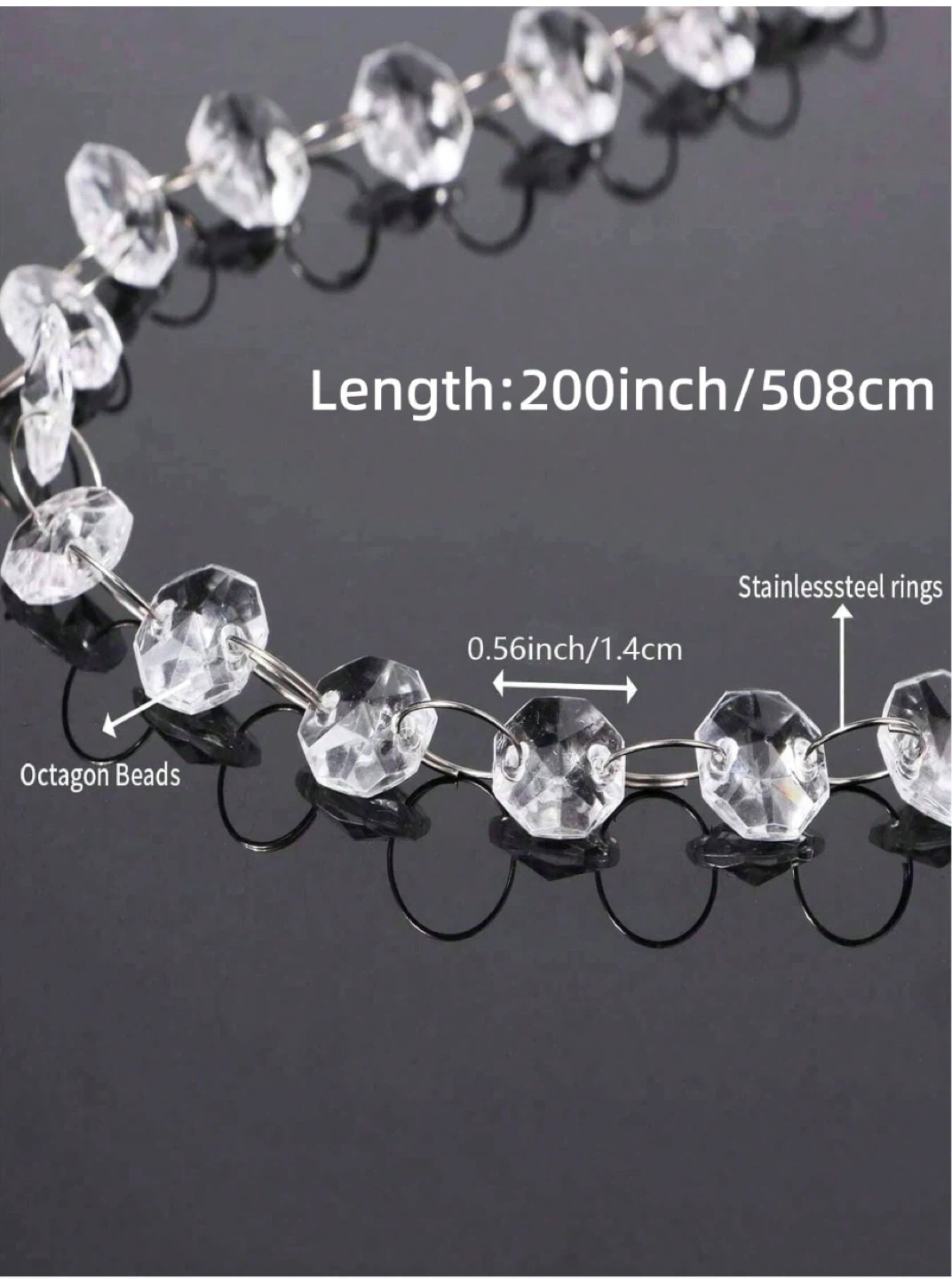 These crystal bead strands are 5 meters long. They're made of clear acrylic beads with silver-toned connectors. Strands are great for DIY decor or adding sparkle to events!