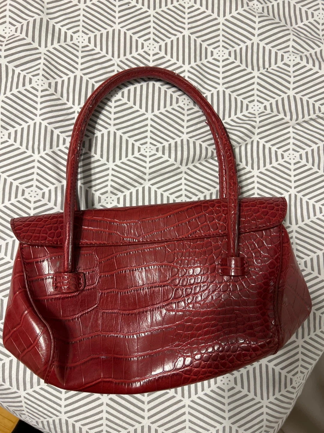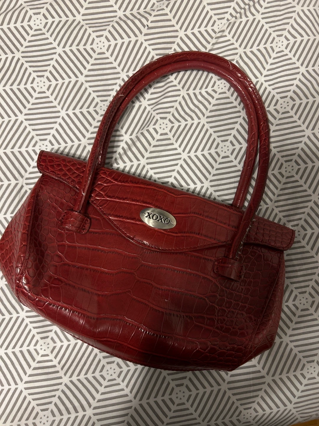 This XOXO handbag features a classic red colour and croc embossed faux leather. It's a stylish choice for everyday use. The bag's interior is clean and ready for your essentials.