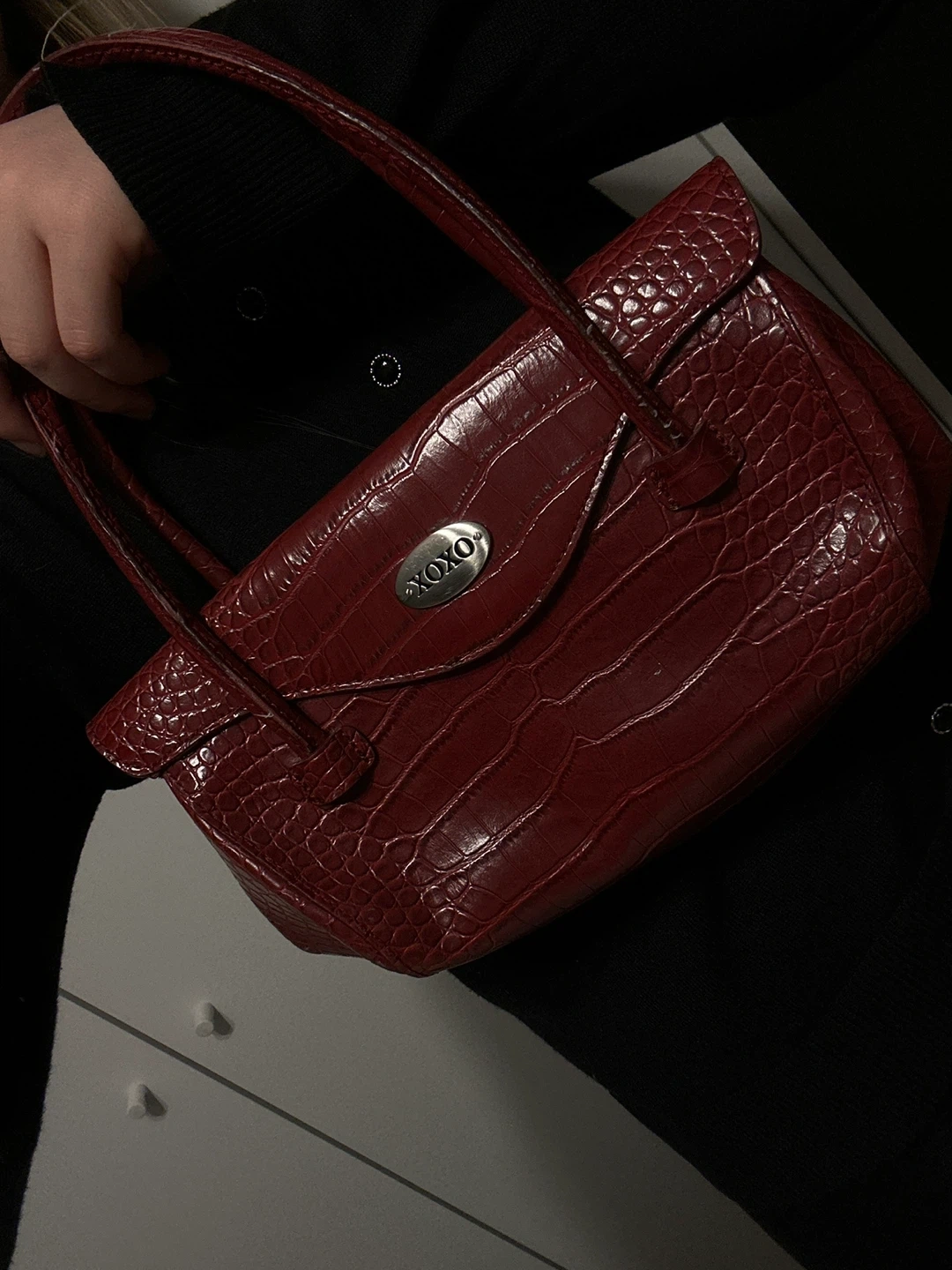 This XOXO handbag features a classic red colour and croc embossed faux leather. It's a stylish choice for everyday use. The bag's interior is clean and ready for your essentials.