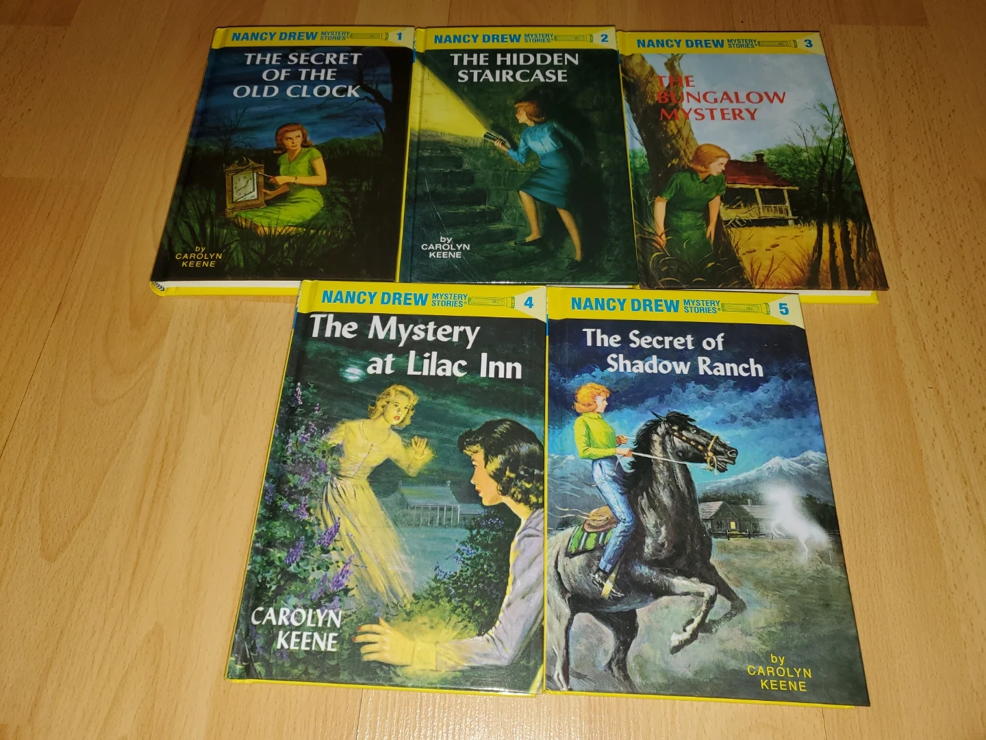Titles are: The Secret of the Old Clock, The Hidden Staircase, The Bungalow Mystery, The Mystery at Lilac Inn, The Secret of Shadow Ranch, The Secret of Red Gate Farm, The Clue in the Diary, Nancy's Mysterious Letter, The Sign of the Twisted Candles, and Password to Larkspur Lane.