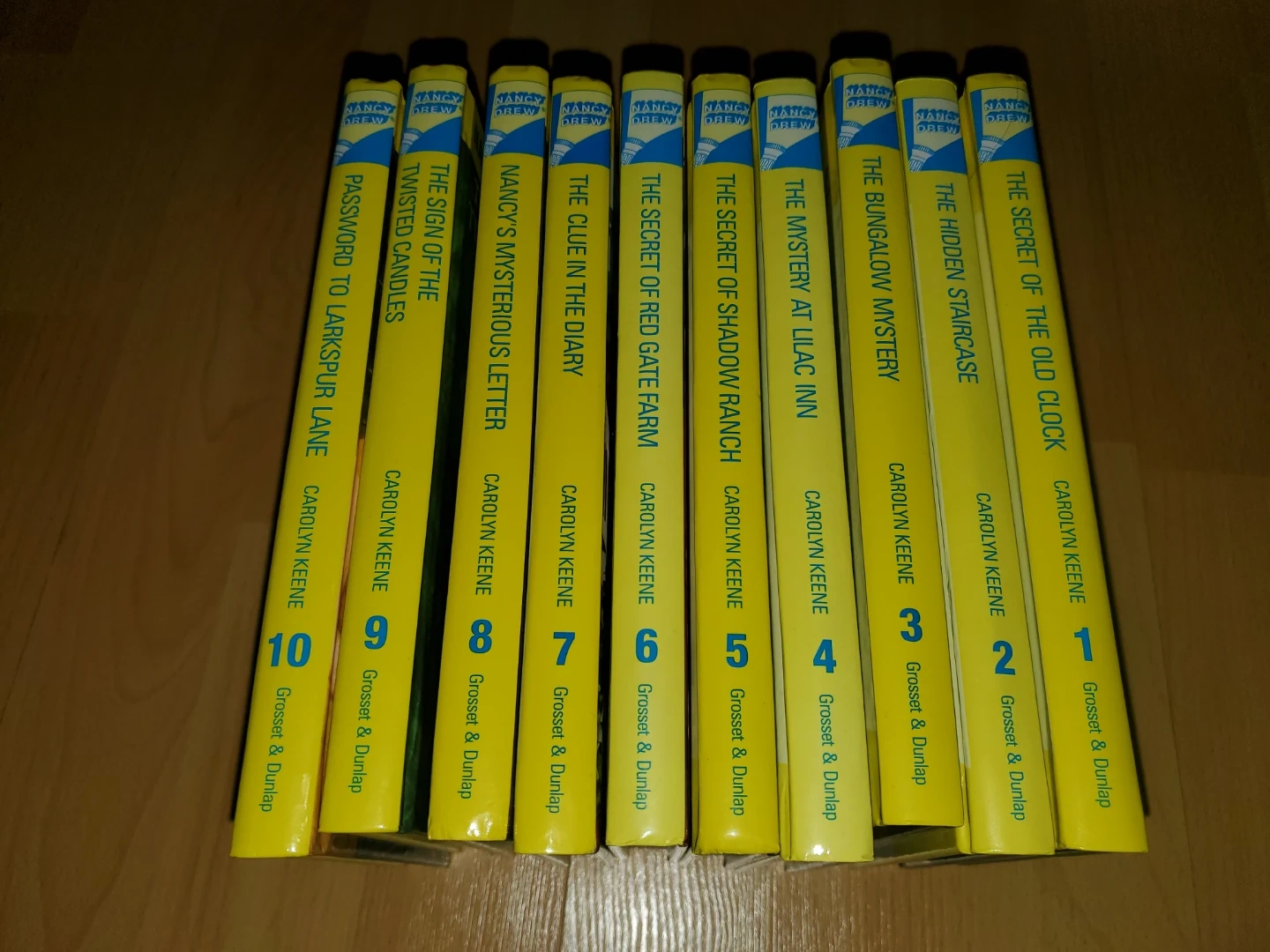 Titles are: The Secret of the Old Clock, The Hidden Staircase, The Bungalow Mystery, The Mystery at Lilac Inn, The Secret of Shadow Ranch, The Secret of Red Gate Farm, The Clue in the Diary, Nancy's Mysterious Letter, The Sign of the Twisted Candles, and Password to Larkspur Lane.