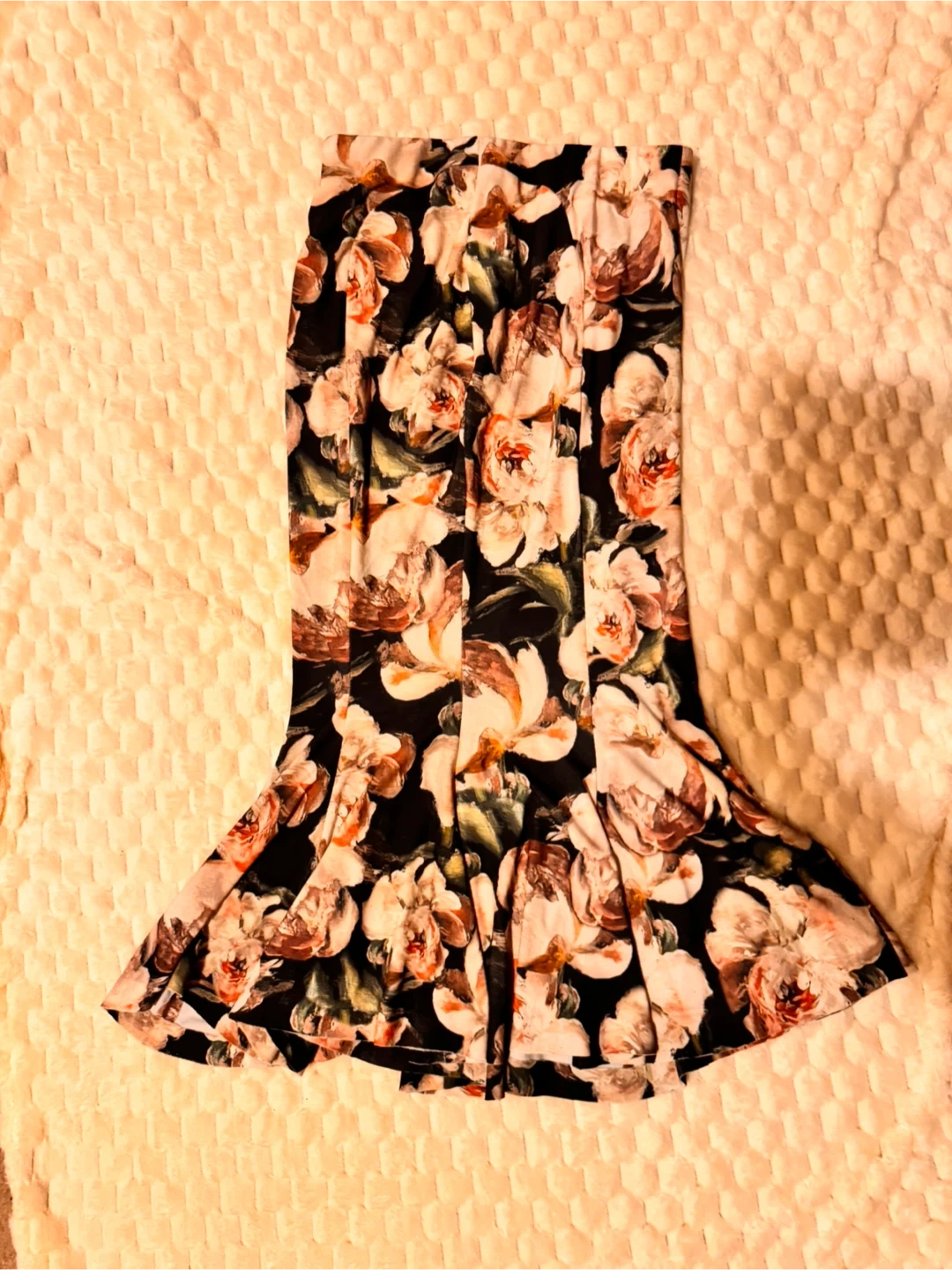 This Norma Kamali midi skirt features a vibrant floral print on a black background. It's designed with a flattering silhouette that flares out towards the hem. The size is XXS/28. It's a great piece for dressing up or down!