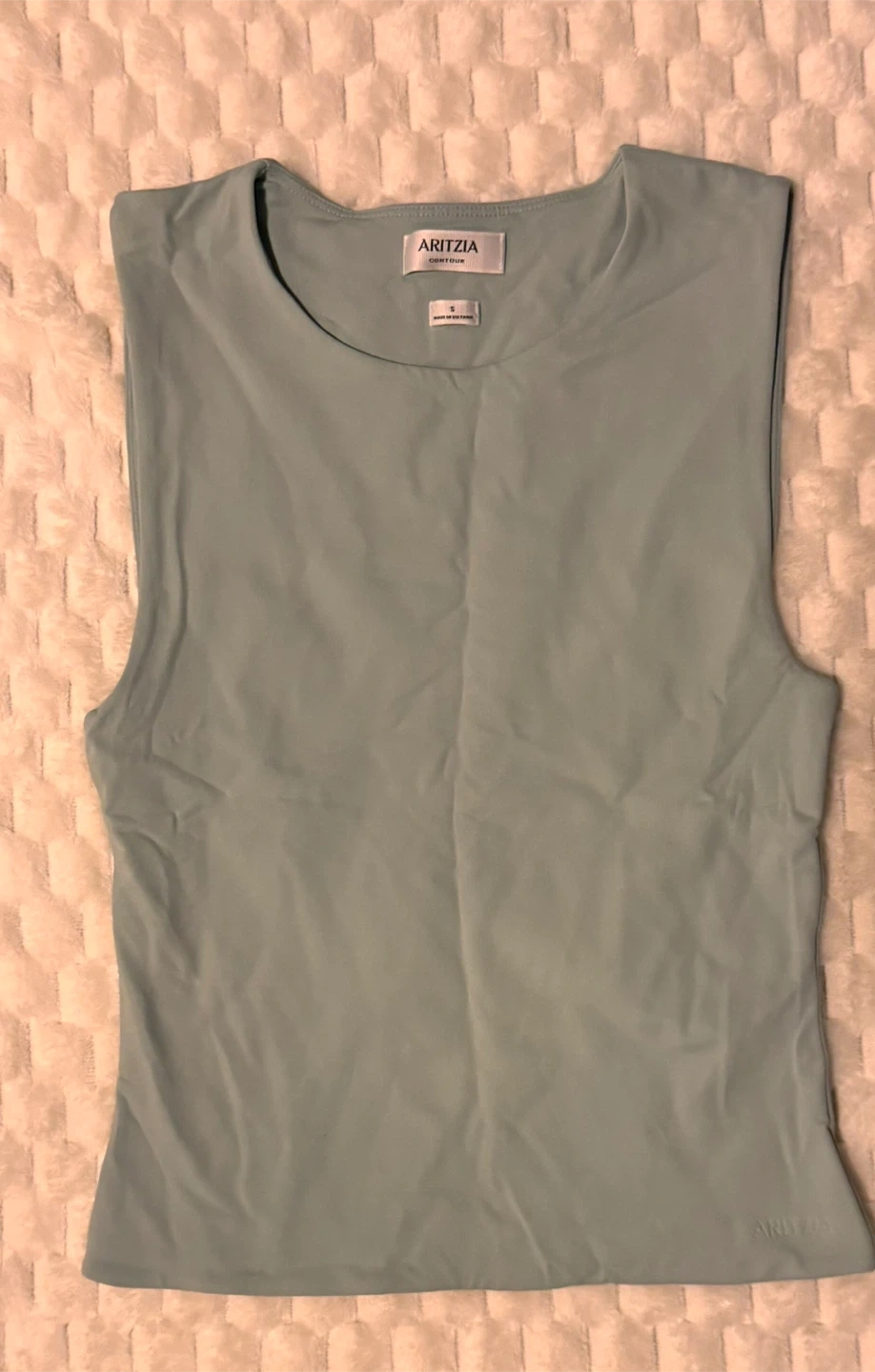 This Aritzia Contour sleeveless top is in a size small. It's a light blue-green colour. Made in Vietnam.