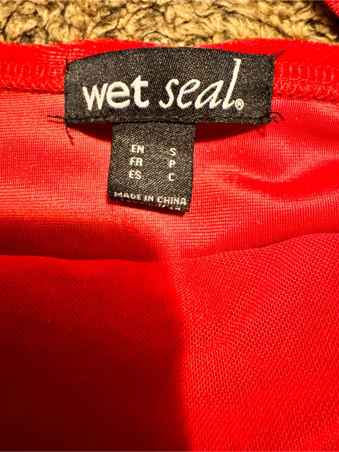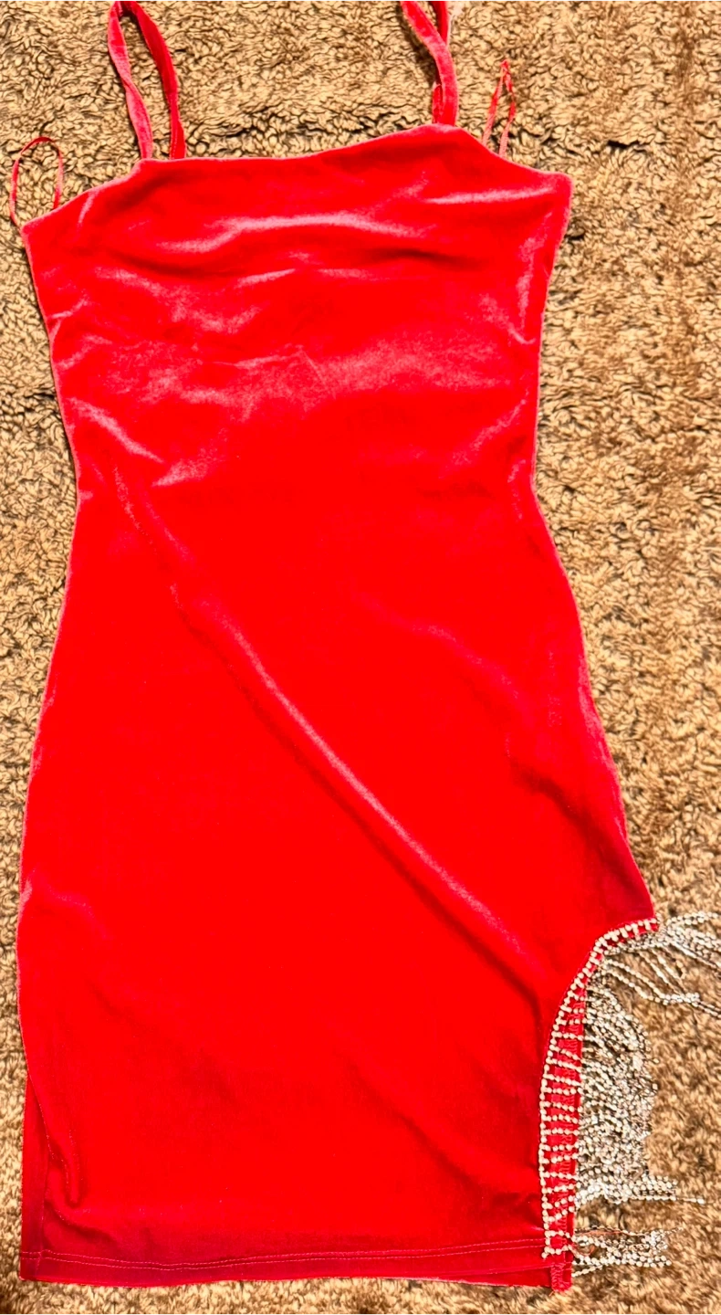 This stylish red velvet mini dress is by Wet Seal. It features a flattering fitted silhouette and is adorned with dazzling rhinestone trim on the side slit. Dress it up for a night out!