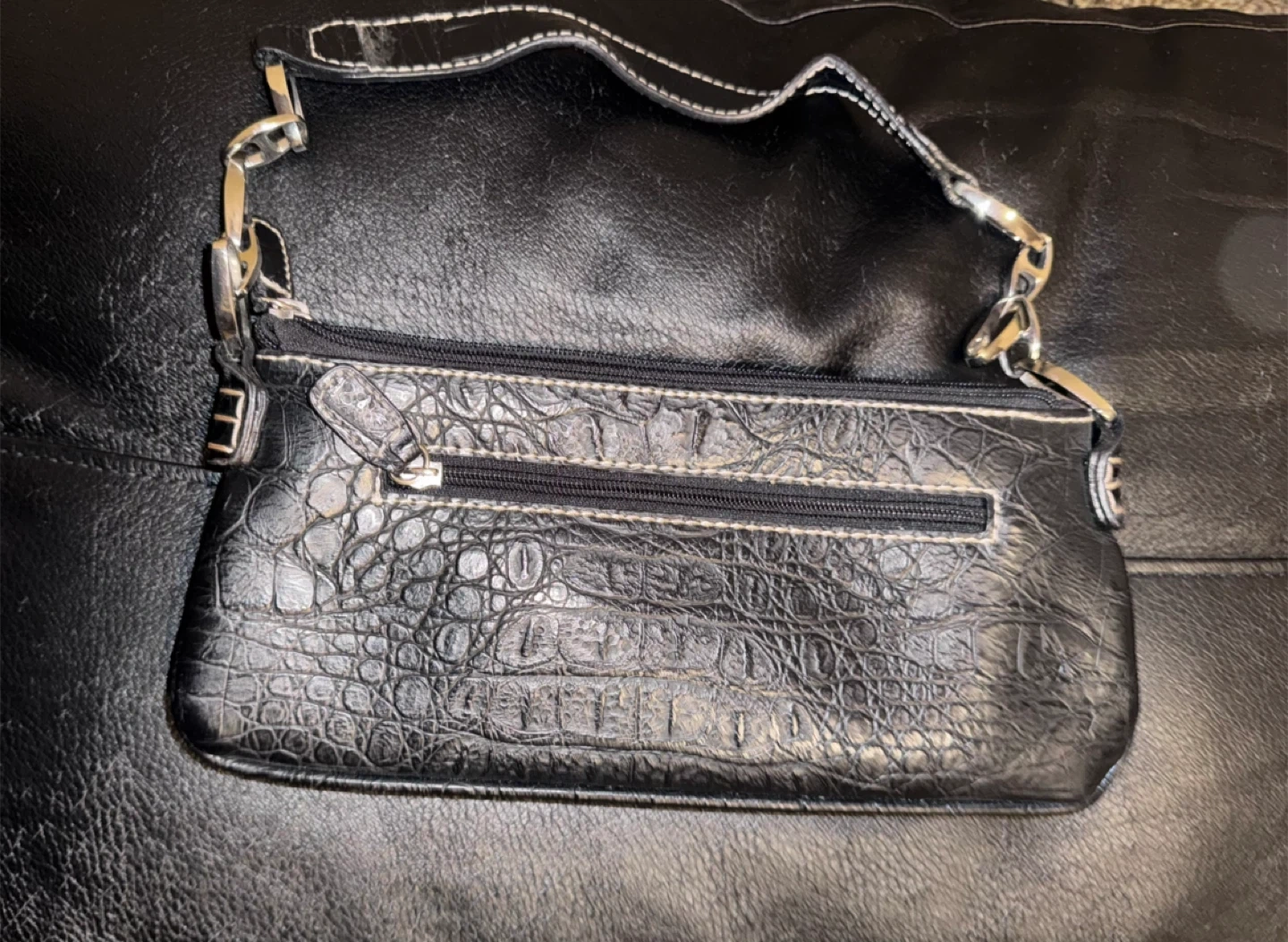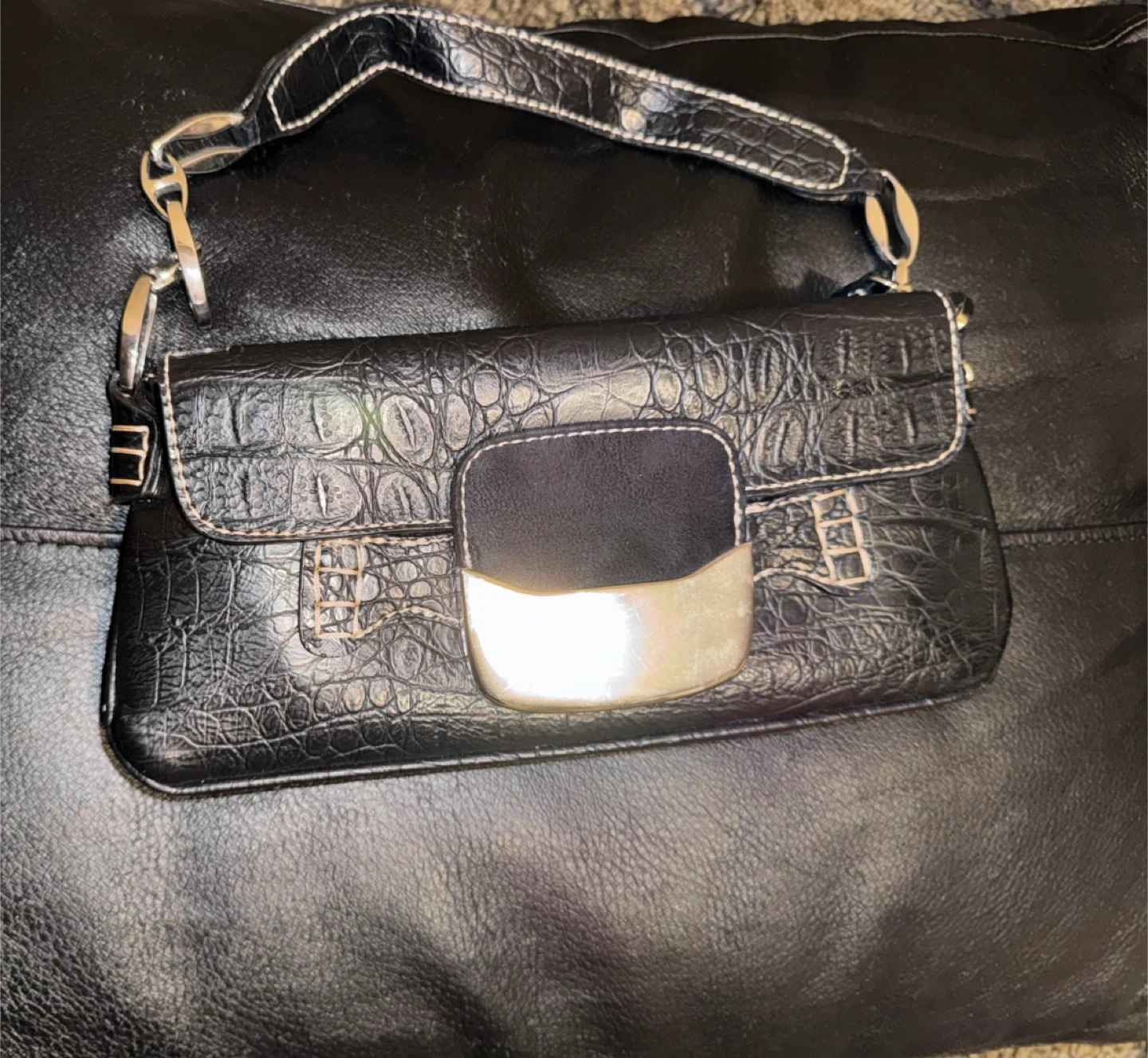This black handbag features a stylish croc-embossed texture and silver hardware accents. It's got a magnetic snap closure and a zippered compartment. This bag is perfect for carrying essentials when you're on the go!