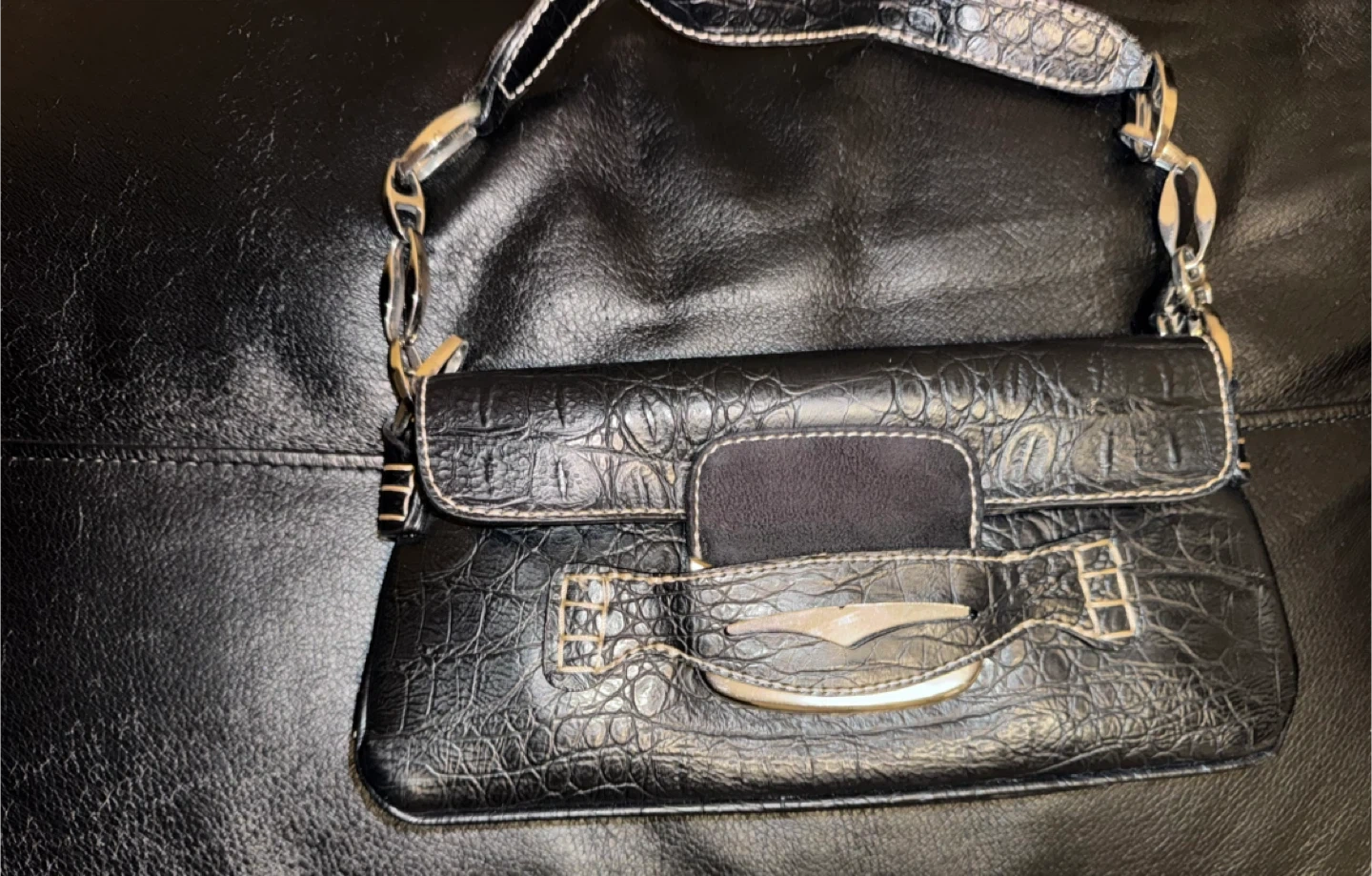 Black Croc-Embossed Handbag with Silver Accents