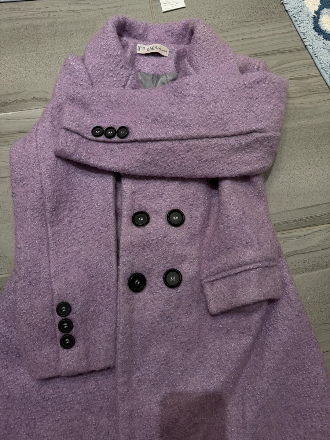 This is a stylish purple wool blend coat. It features a textured fabric and double-breasted button closure.💜