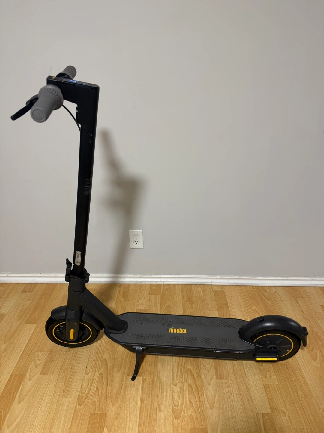 This is a Ninebot electric scooter. It's black with yellow accents. It has a built-in headlight for visibility. It’s used like new and it’s very nice for outdoors