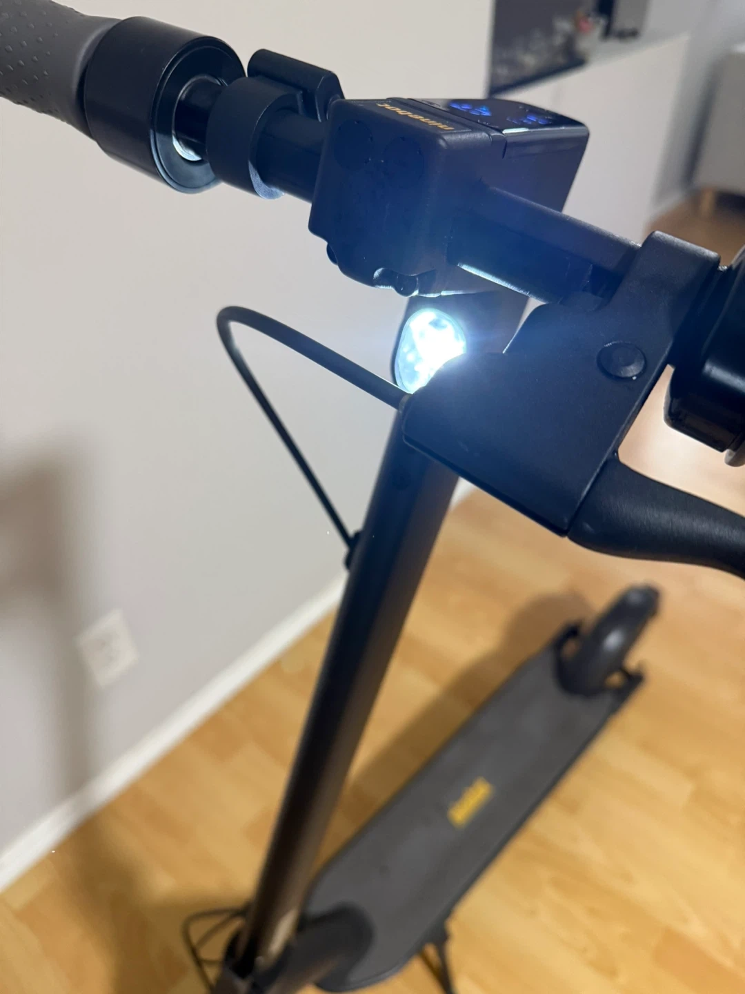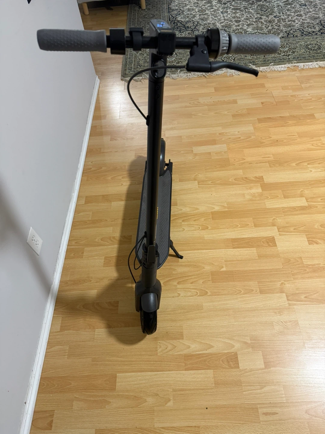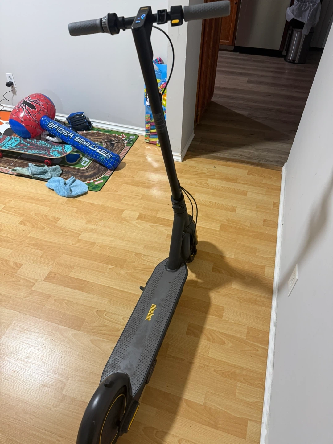 This is a Ninebot electric scooter. It's black with yellow accents. It has a built-in headlight for visibility. It’s used like new and it’s very nice for outdoors