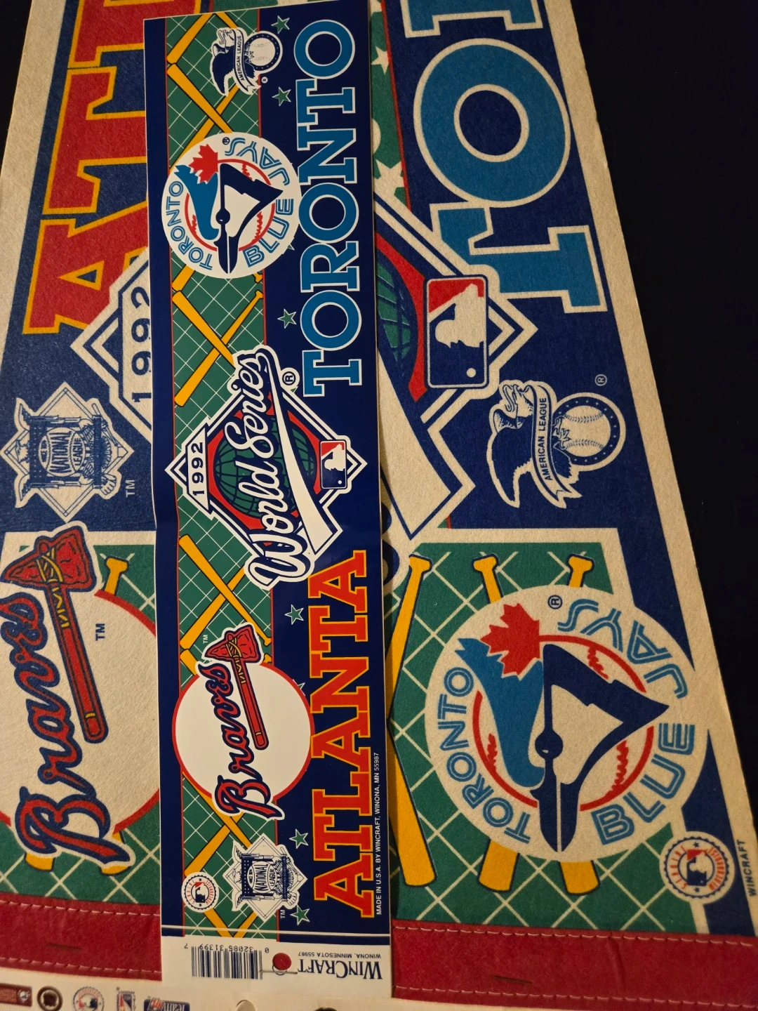 This lot includes a 1992 World Series scorebook, a large Toronto Blue Jays American League Champions 1992 pin, a smaller pin featuring both the Atlanta Braves and Toronto Blue Jays, and a Fan Pack with pennant and Bumper Sticker with Atlanta and Toronto designs. It's a fantastic collection for any baseball fan!
