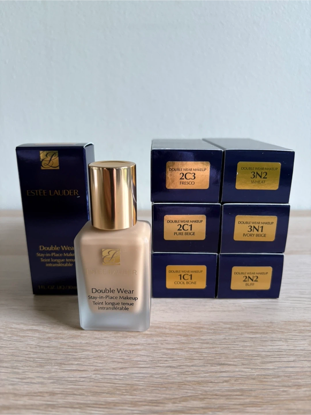 This is Estée Lauder Double Wear Stay-in-Place Makeup. It's 1 fl. oz. or 30 ml. Multiple shades are available, including 2C3 Fresco, 3N2 Wheat, 2C1 Pure Beige, 3N1 Ivory Beige, 1C1 Cool Bone, and 2N2 Buff.