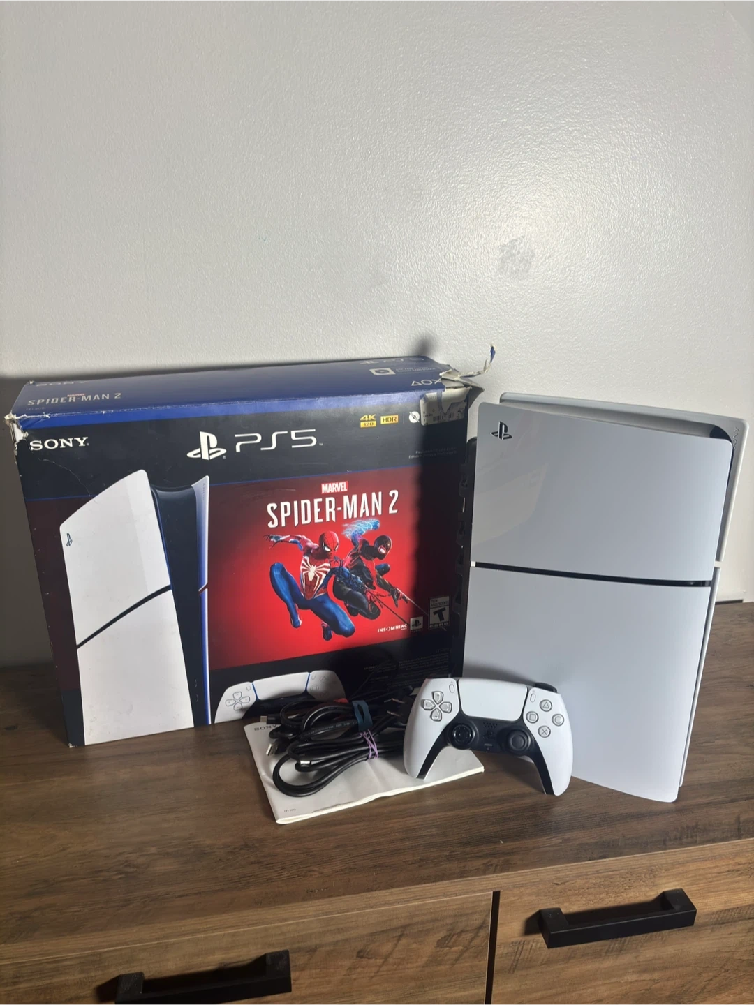 A clean and fully working PS5 Slim Digital Spider-Man 2 Edition, complete with all accessories and original packaging.