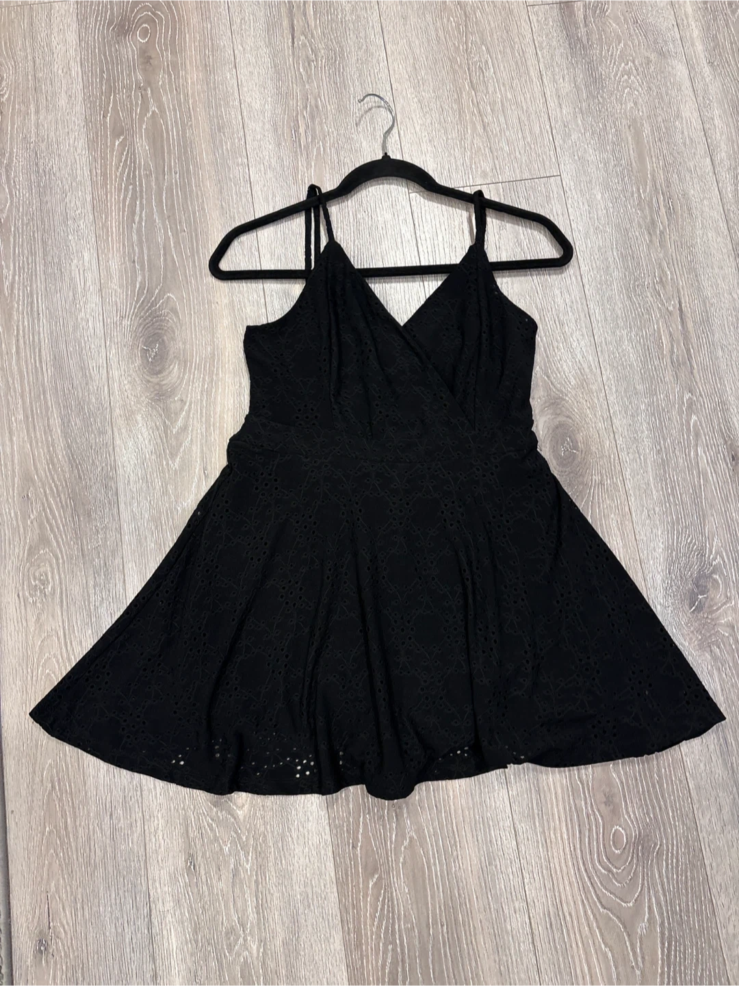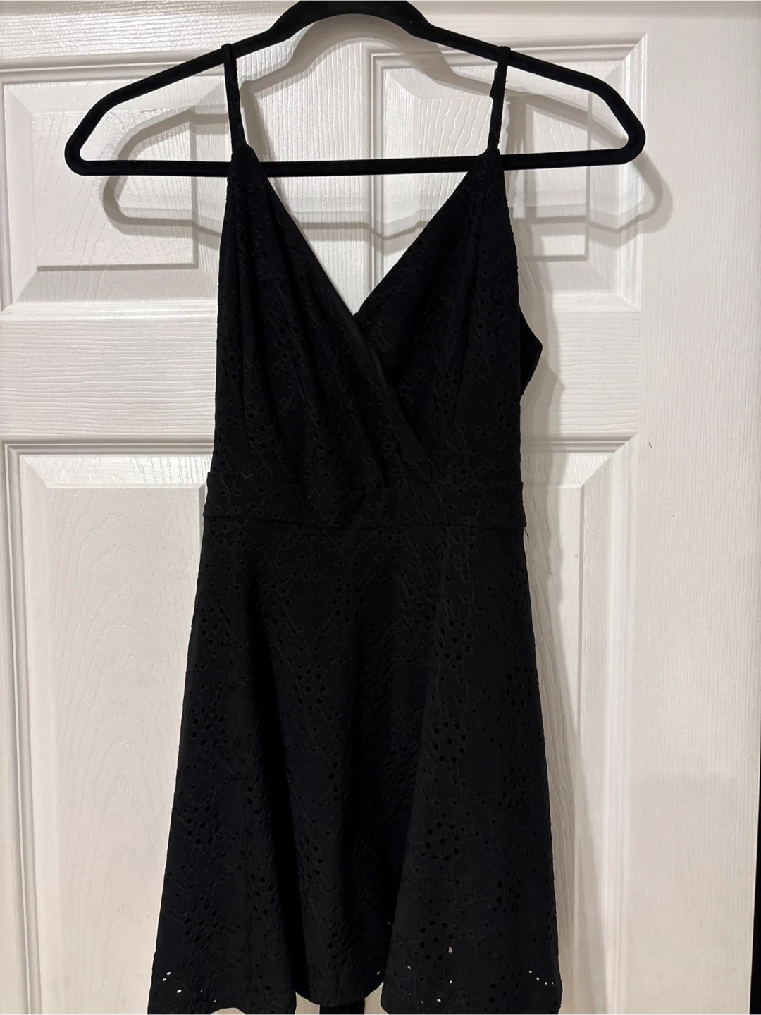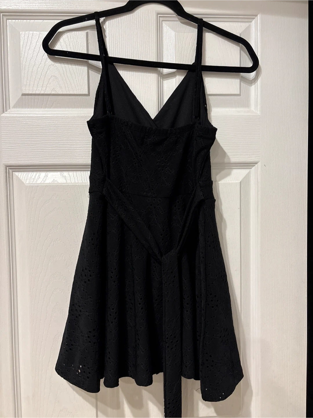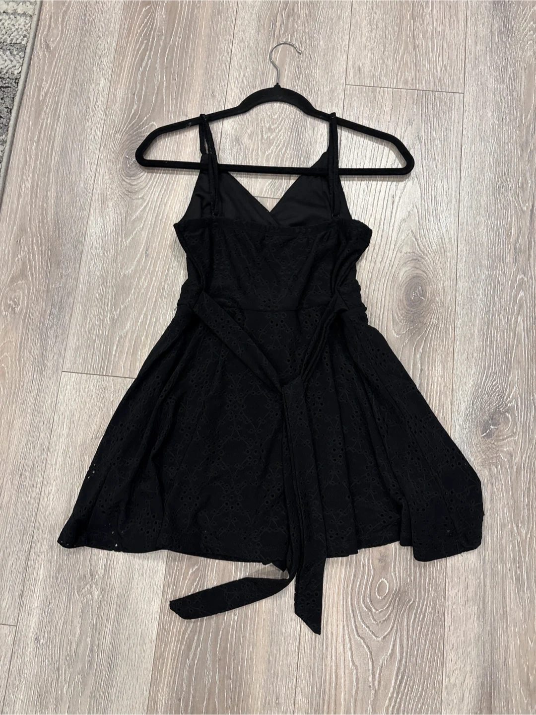 This is a cute black sundress with a lovely eyelet pattern. It features a v-neckline and a tie waist for an adjustable fit. It's perfect for warmer days! size L