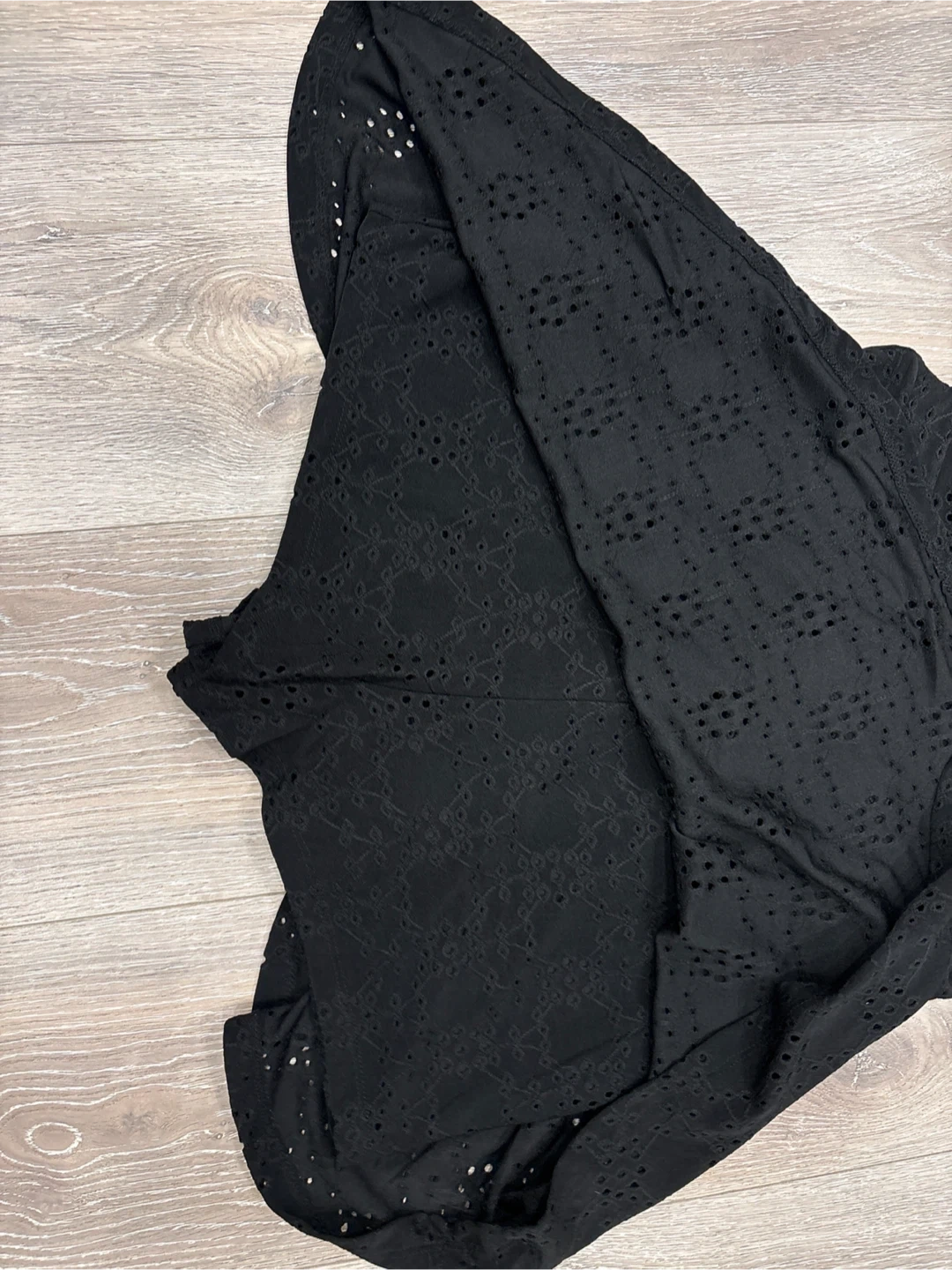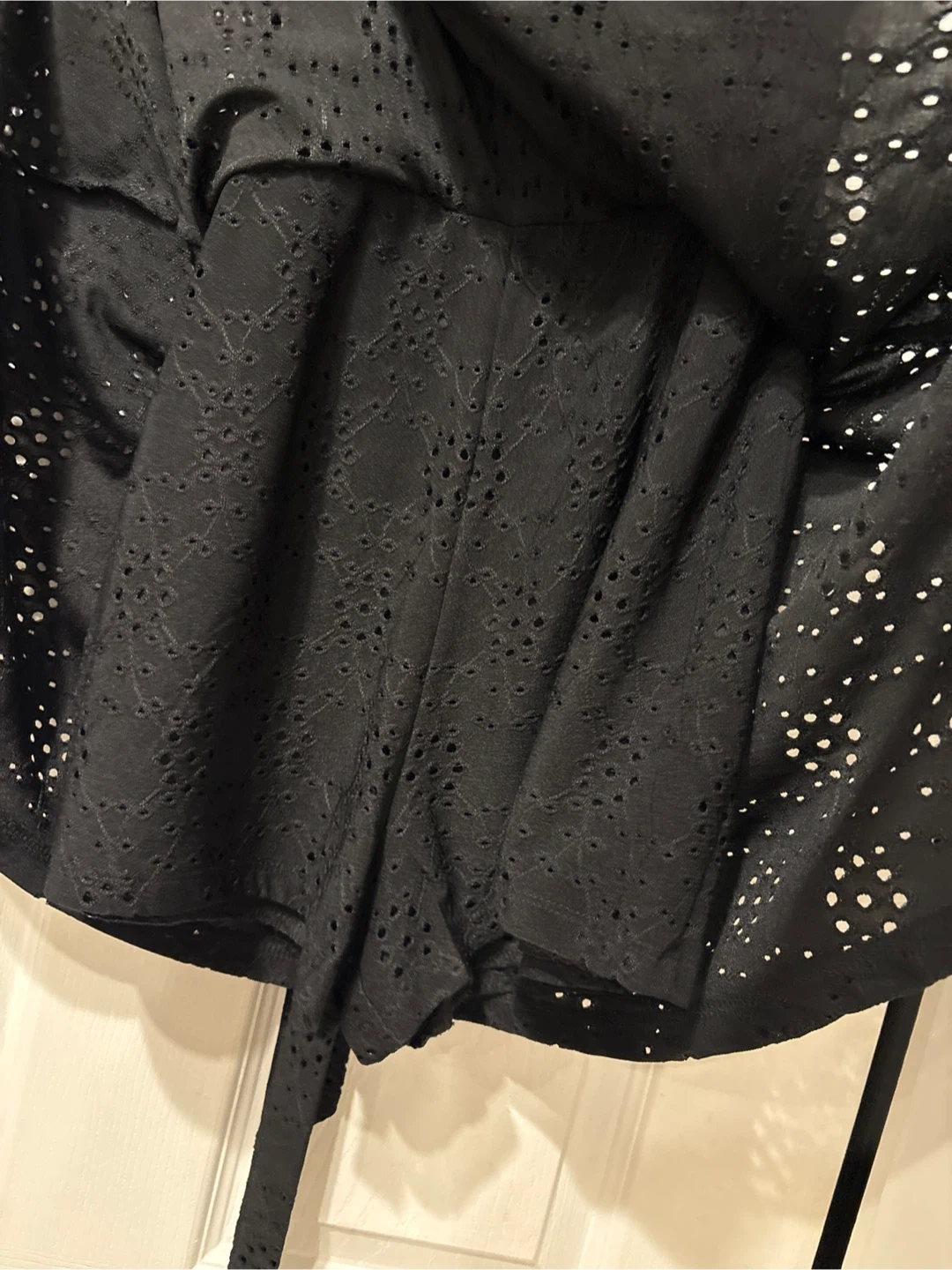 This is a cute black sundress with a lovely eyelet pattern. It features a v-neckline and a tie waist for an adjustable fit. It's perfect for warmer days! size L