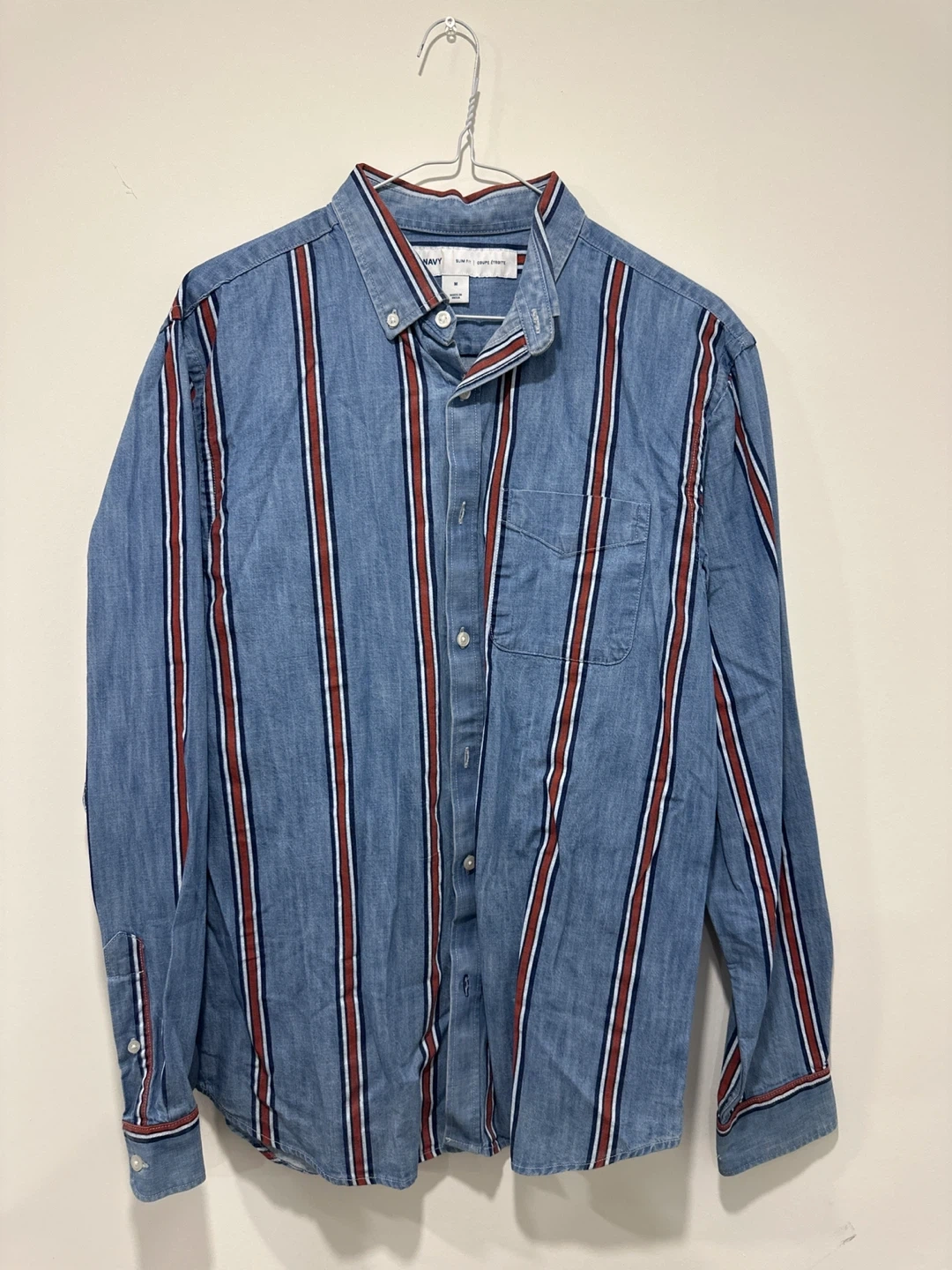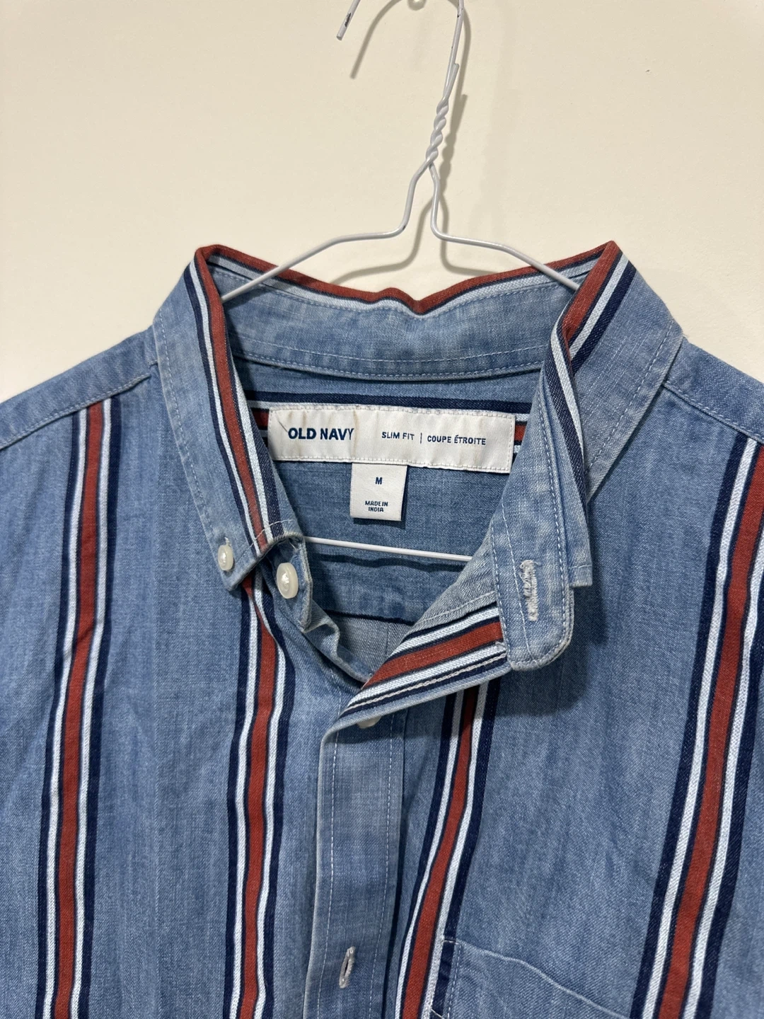 This is an Old Navy men's long-sleeved button-down shirt. It features a blue denim-like fabric with vertical red and white stripes. Slim fit. Made in India.
