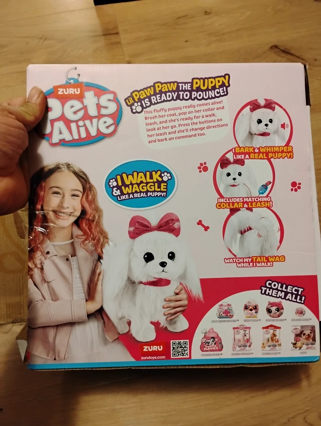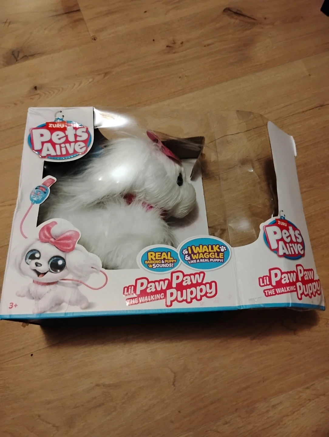 This Lil' Paw Paw The Walking Puppy from ZURU Pets Alive is ready to pounce! It barks, whimpers, walks, and wiggles its tail on command. Includes a matching collar and leash. Recommended for ages 3 and up.
