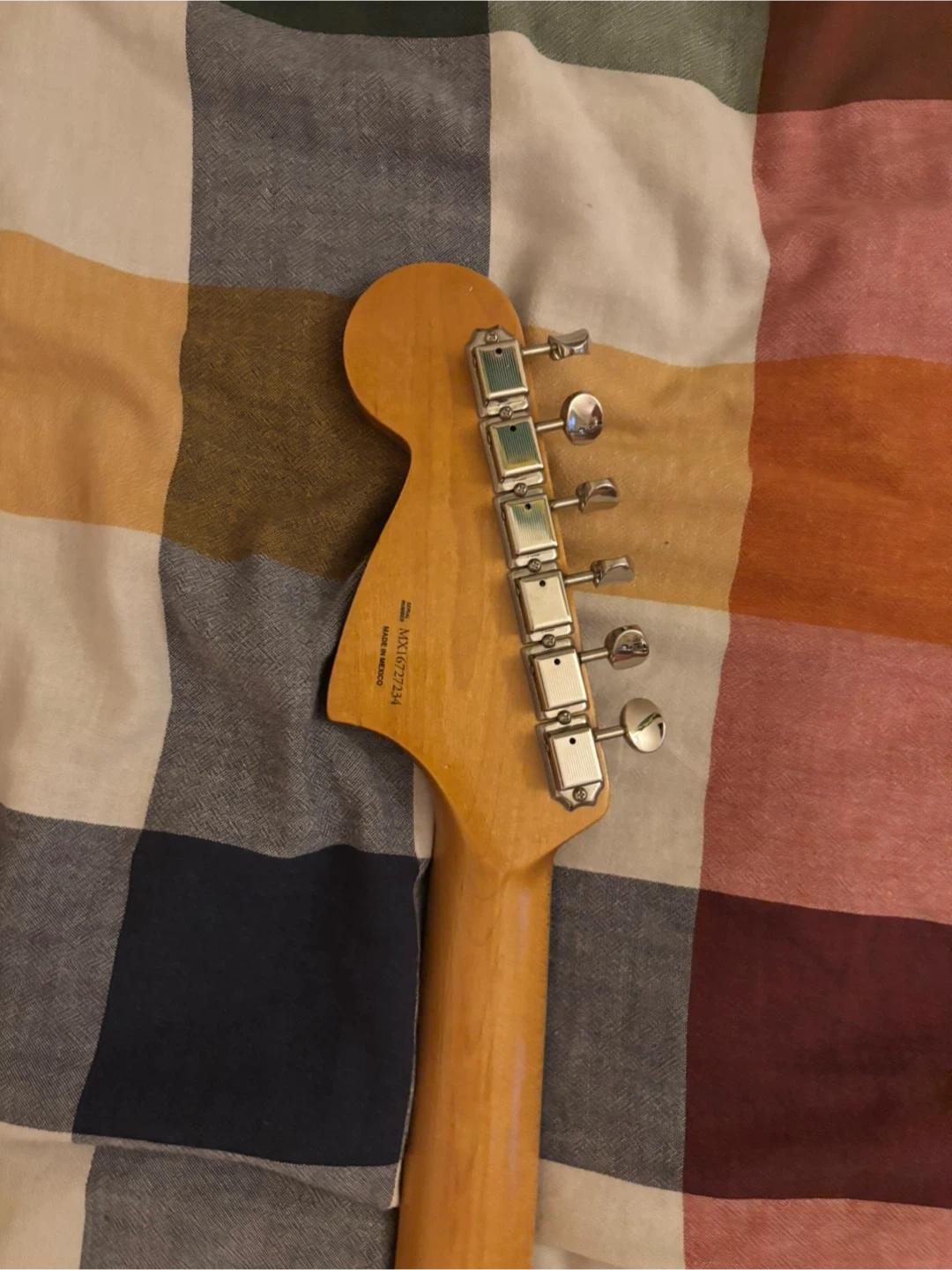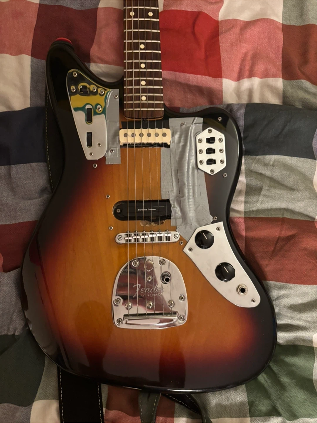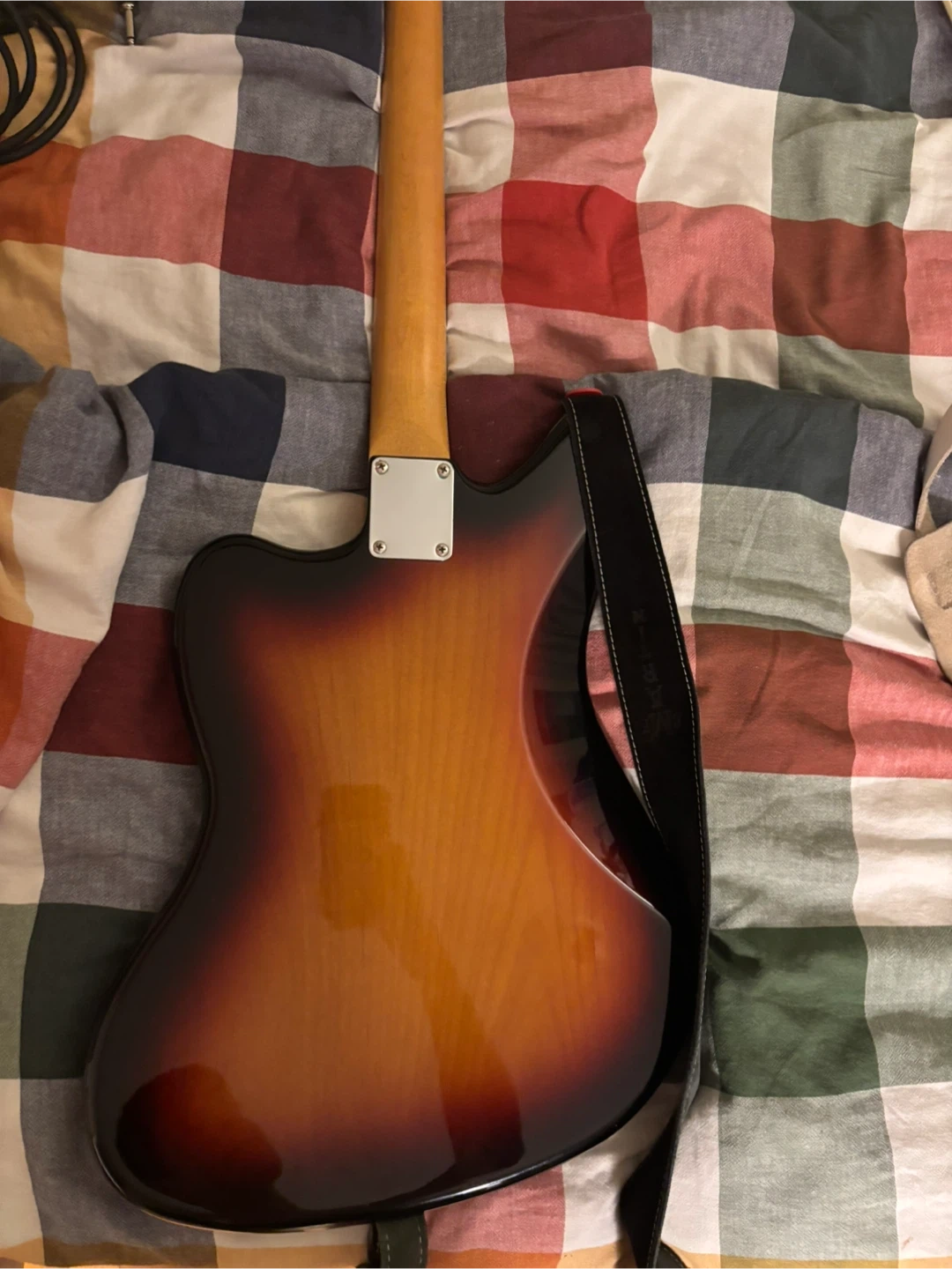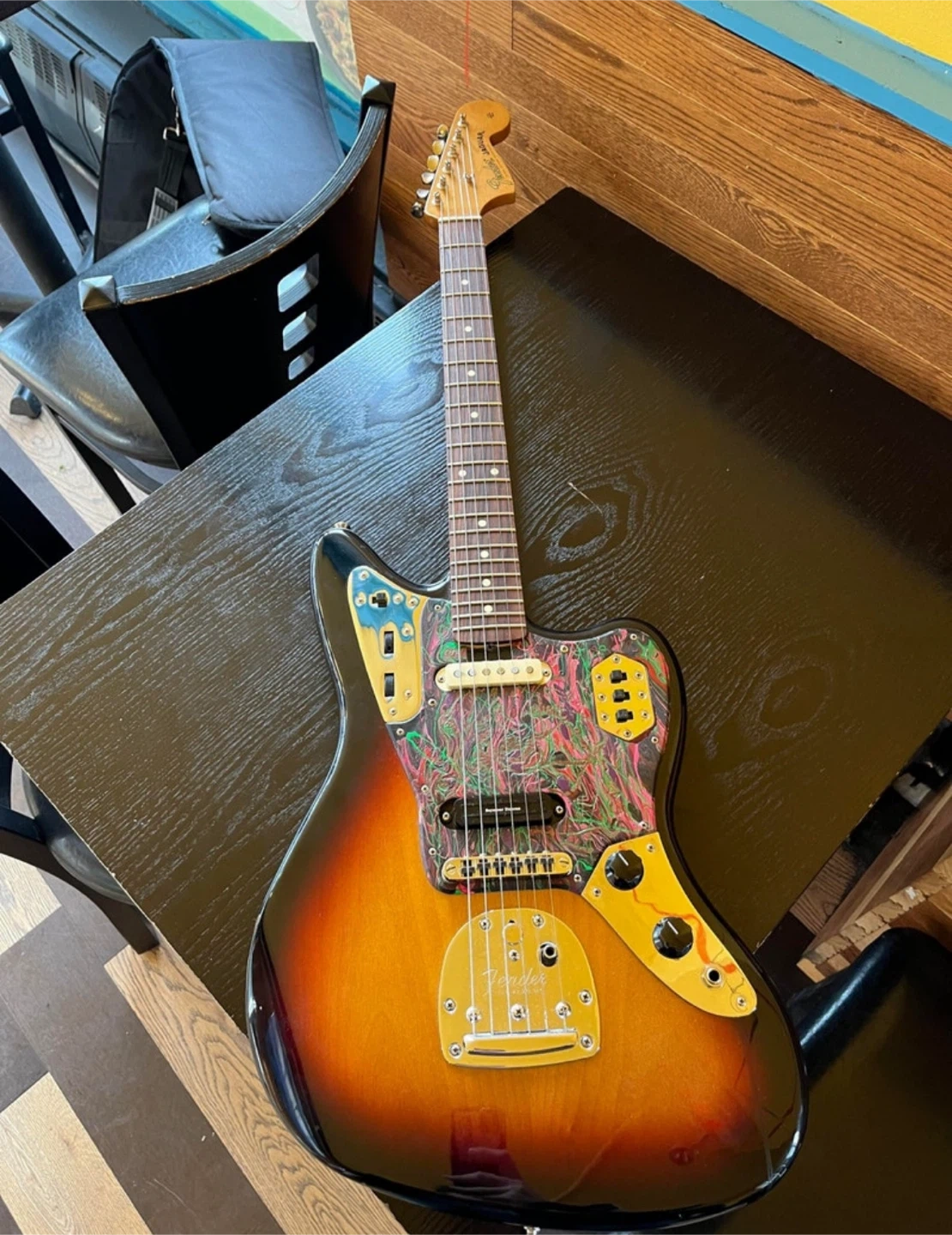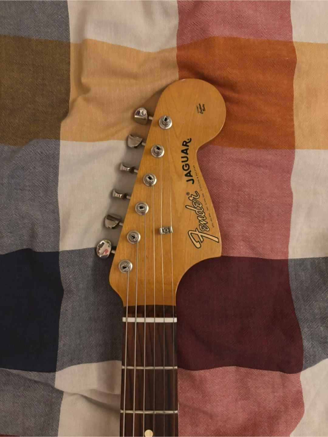 This is a Fender Jaguar electric guitar with a sunburst finish. It's a classic model, and it's ready for a new home. Includes a guitar cable.
