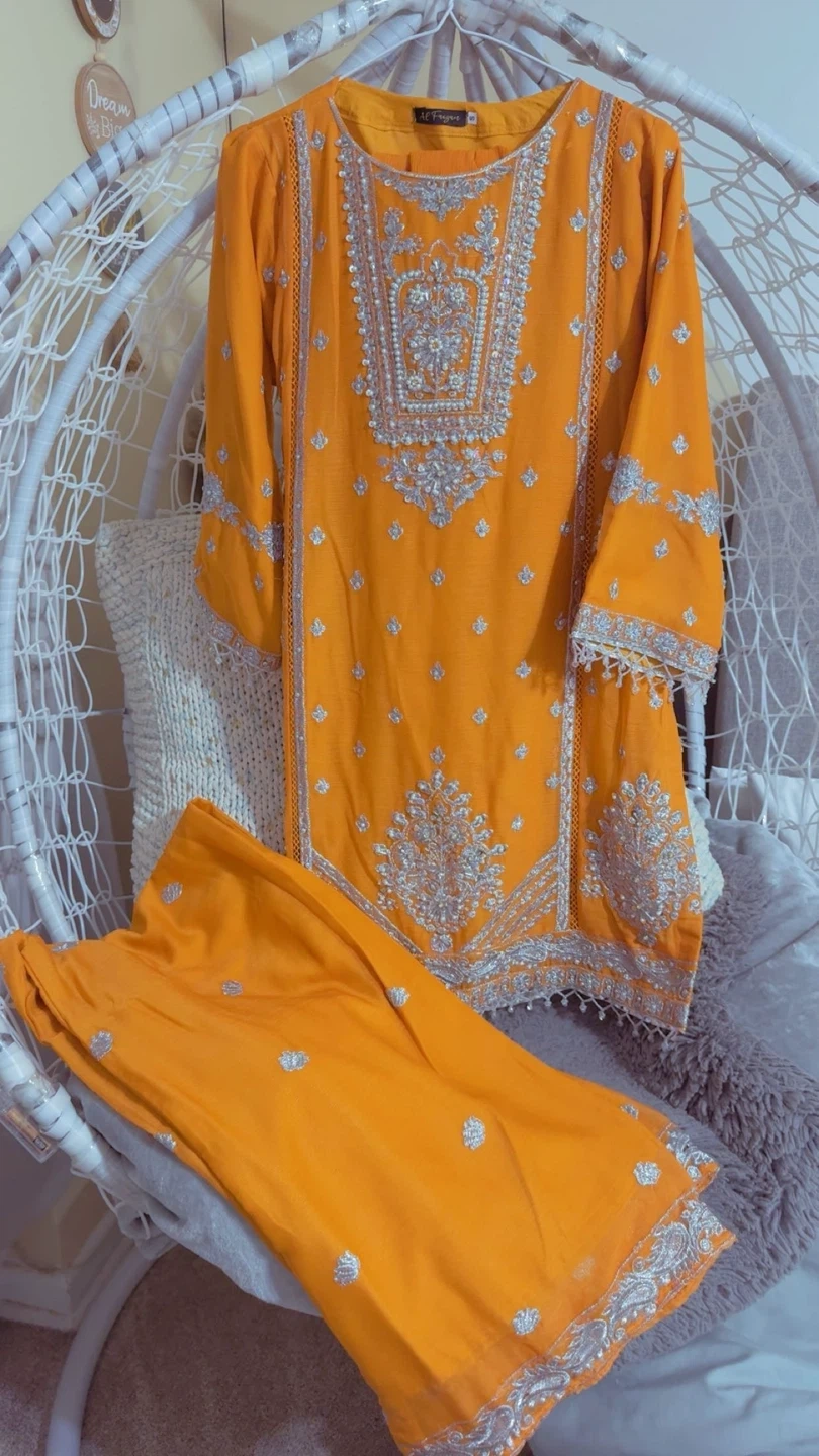 Mayo /Mehendi dress with intricate silver embroidery. This outfit includes a kameez and matching palazo pants. The embroidery is on the neckline, sleeves, and the front of the kameez. Perfect for cultural events or festive occasions!