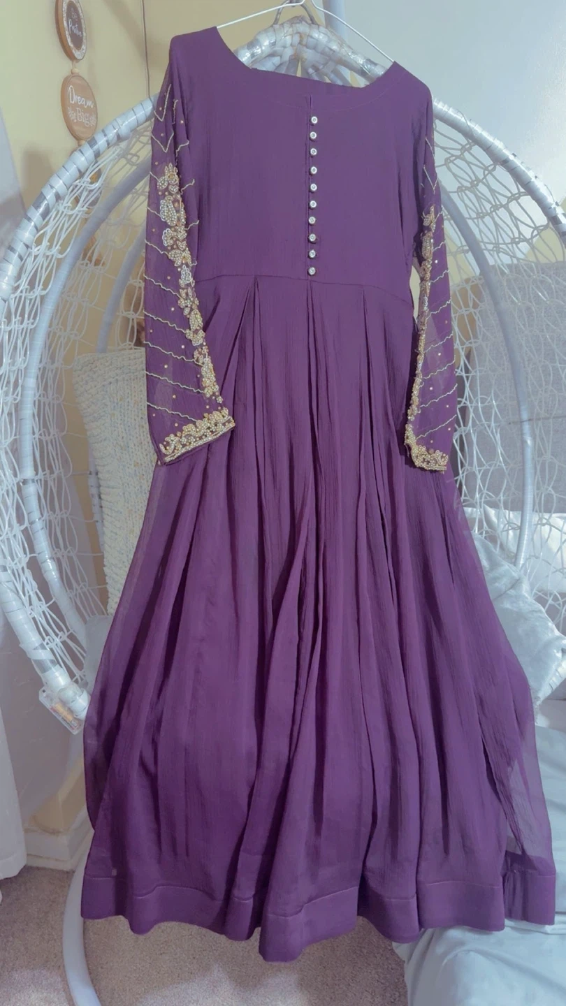 Beautiful flowing maxi dress in a deep purple hue. Features intricate gold and pearl embellishments on the sleeves and bodice. Full pleated skirt with a rounded neckline and button detailing. Perfect for special occasions!