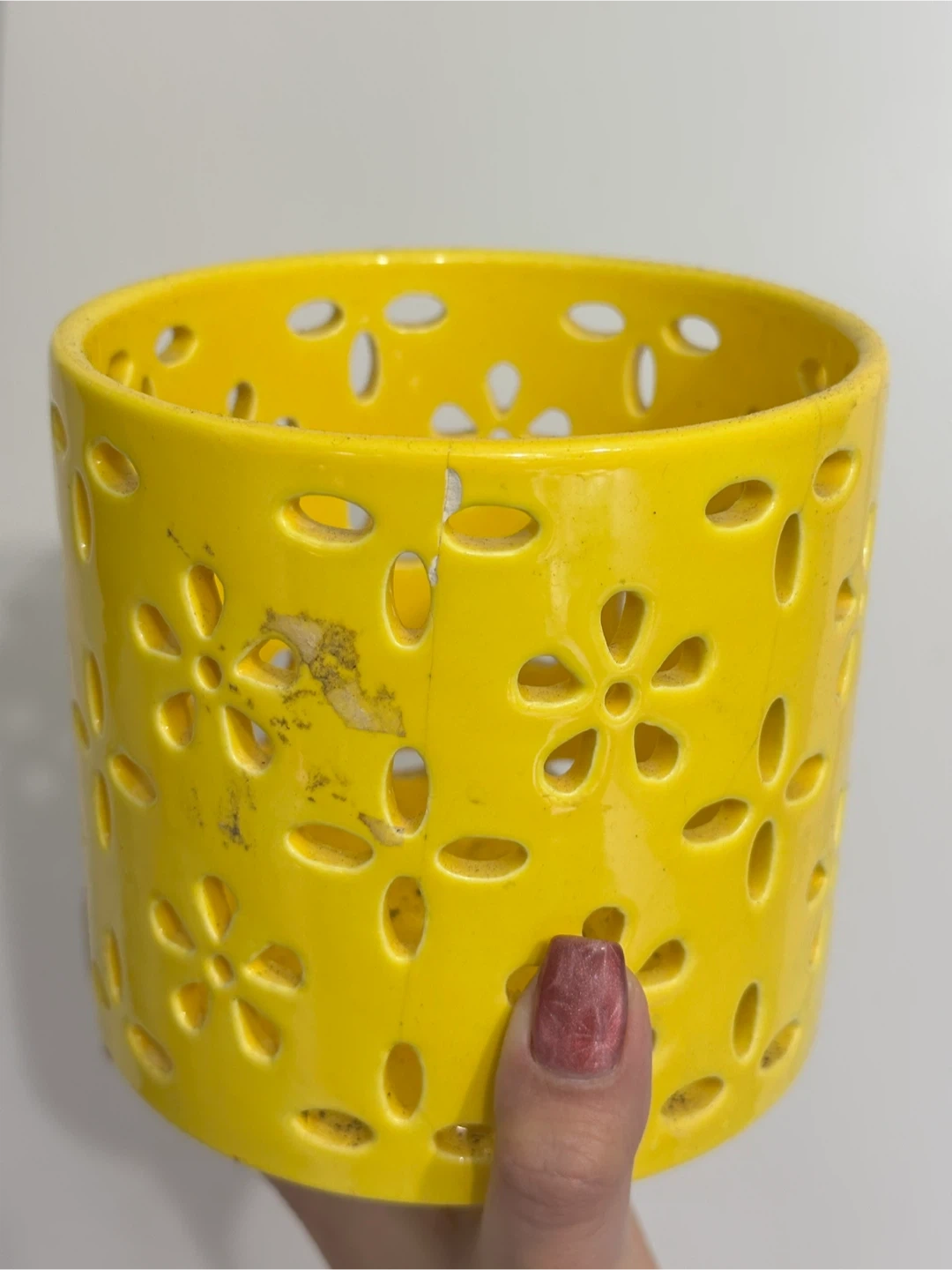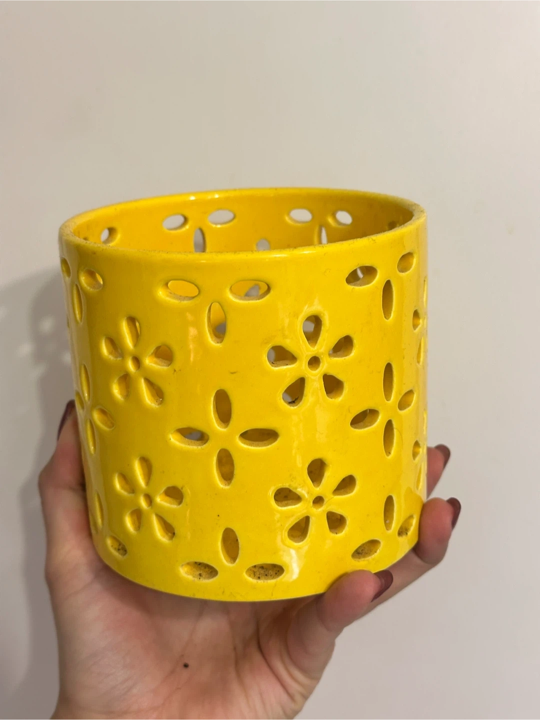 Can be used as a planter or to hold tea candles and cast a cute shadow. Has a small crack on one side but doesn't affect function.