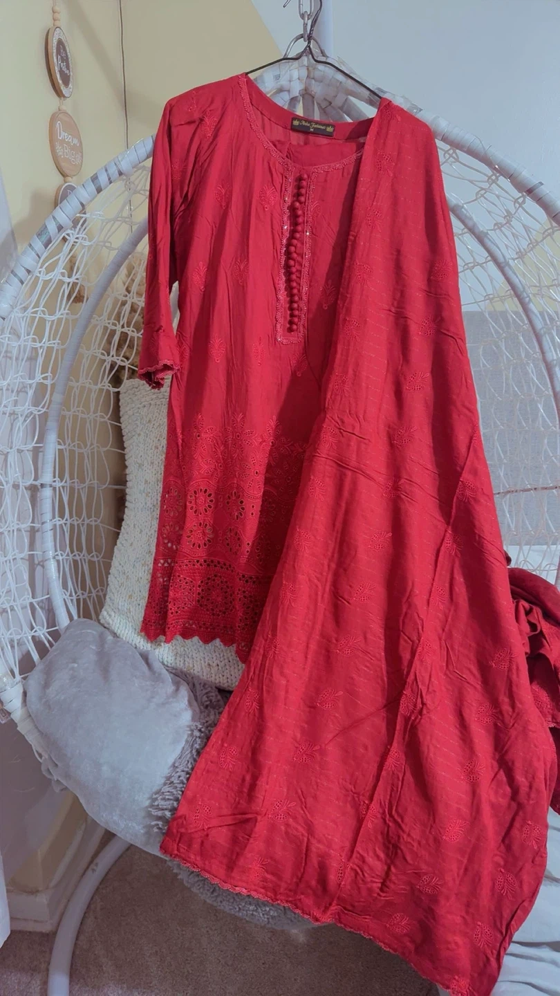 Red cotton suit with schiffli (broderie anglaise)and cut work details with heavy shawl.