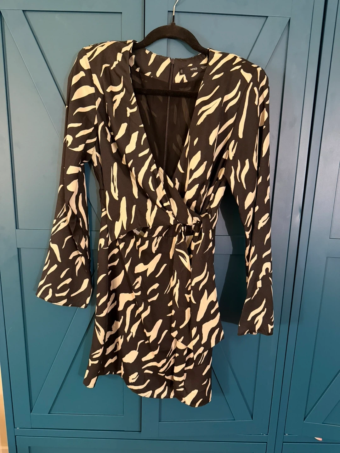 This MNG wrap dress features a bold black and white zebra print. It's designed with a V-neckline and long sleeves, cinching at the waist with a tie closure. Size is small.