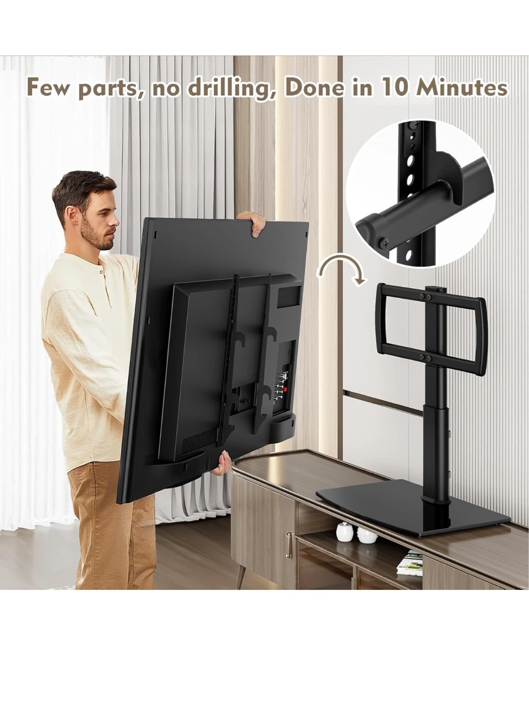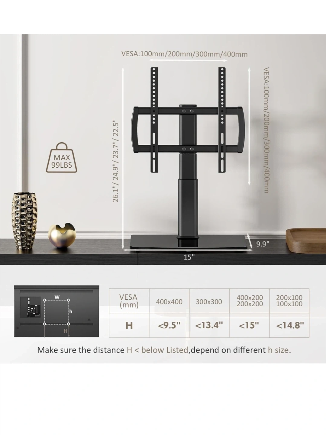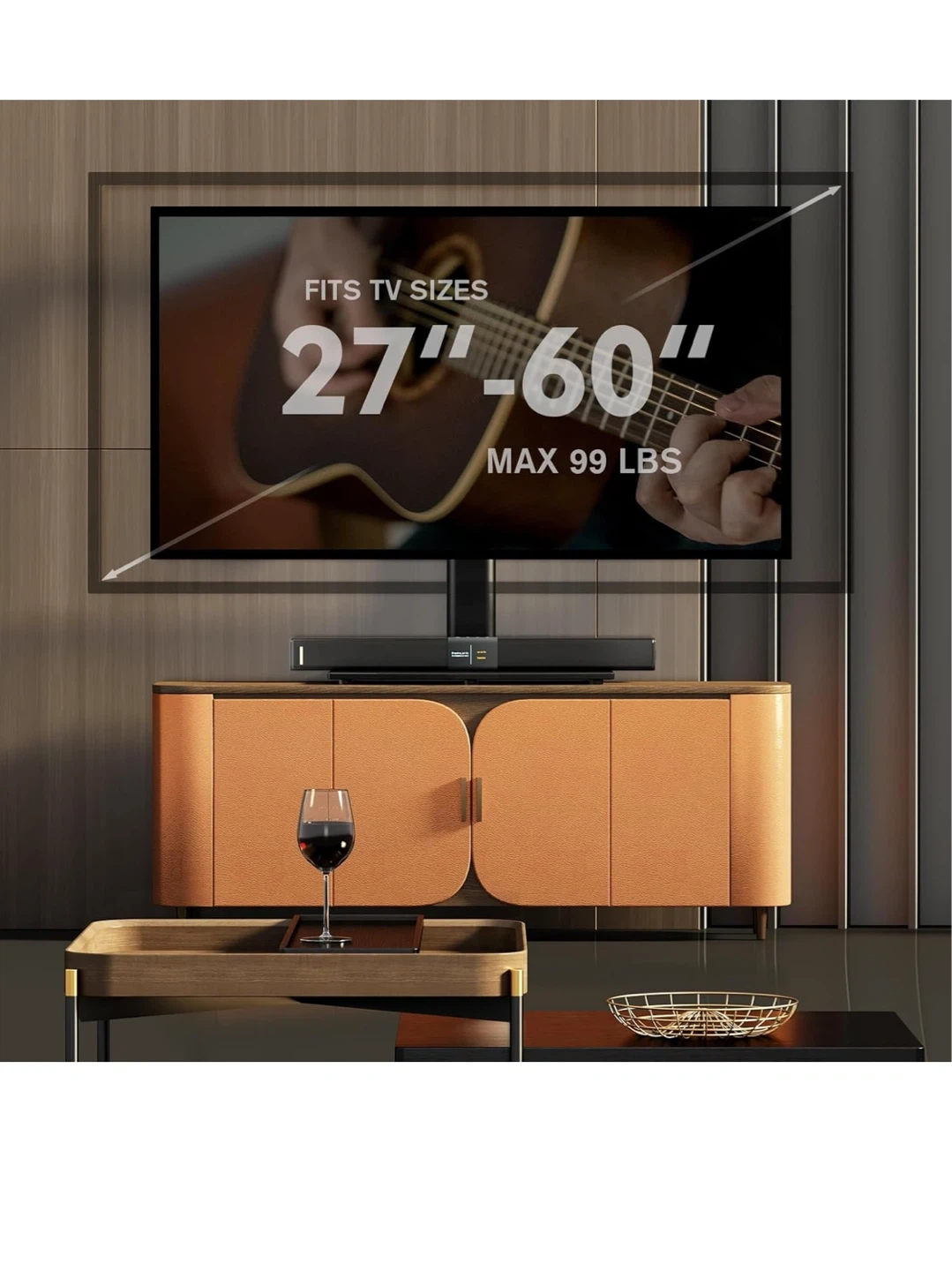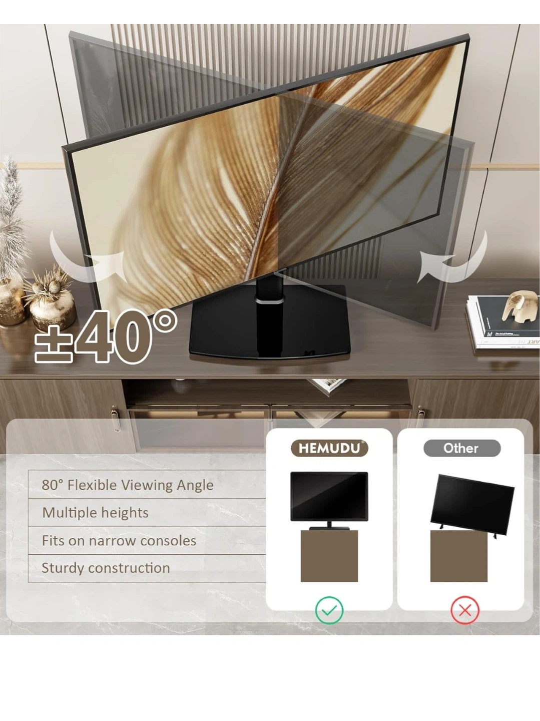 This HEMUDU TV stand supports TVs from 27" to 60" and holds up to 99 lbs. It's adjustable to 4 height levels, with a minimum height of 22.5" and a maximum of 26.1". The viewing angle is flexible up to +/- 40 degrees. Fits on narrow consoles with sturdy construction. Easy to assemble in about 10 minutes with few parts and no drilling required.