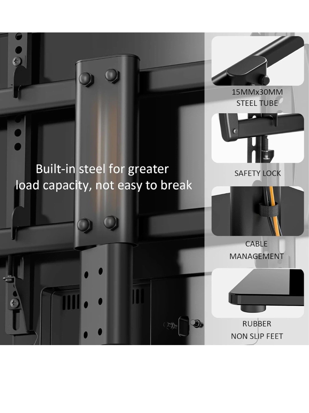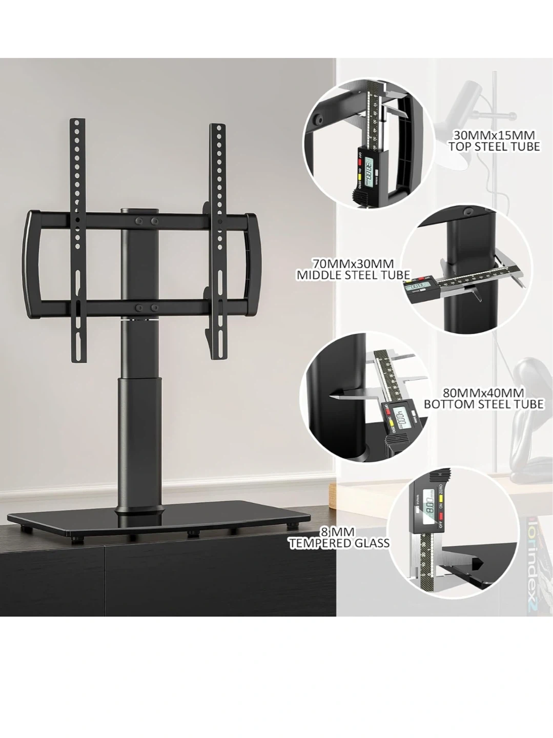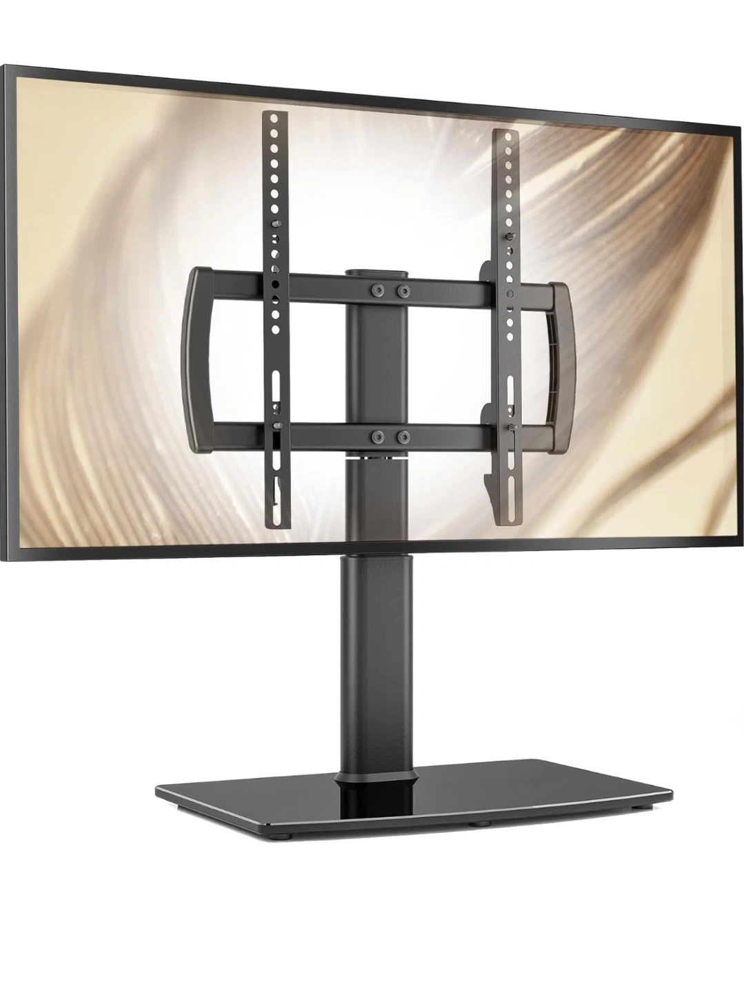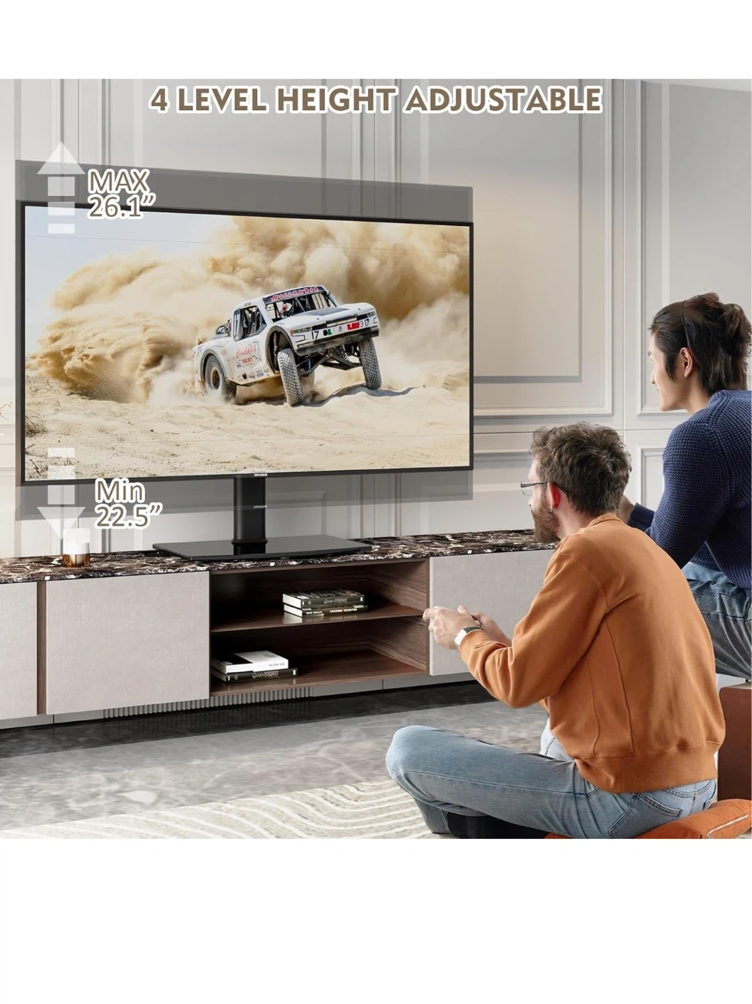 This HEMUDU TV stand supports TVs from 27" to 60" and holds up to 99 lbs. It's adjustable to 4 height levels, with a minimum height of 22.5" and a maximum of 26.1". The viewing angle is flexible up to +/- 40 degrees. Fits on narrow consoles with sturdy construction. Easy to assemble in about 10 minutes with few parts and no drilling required.